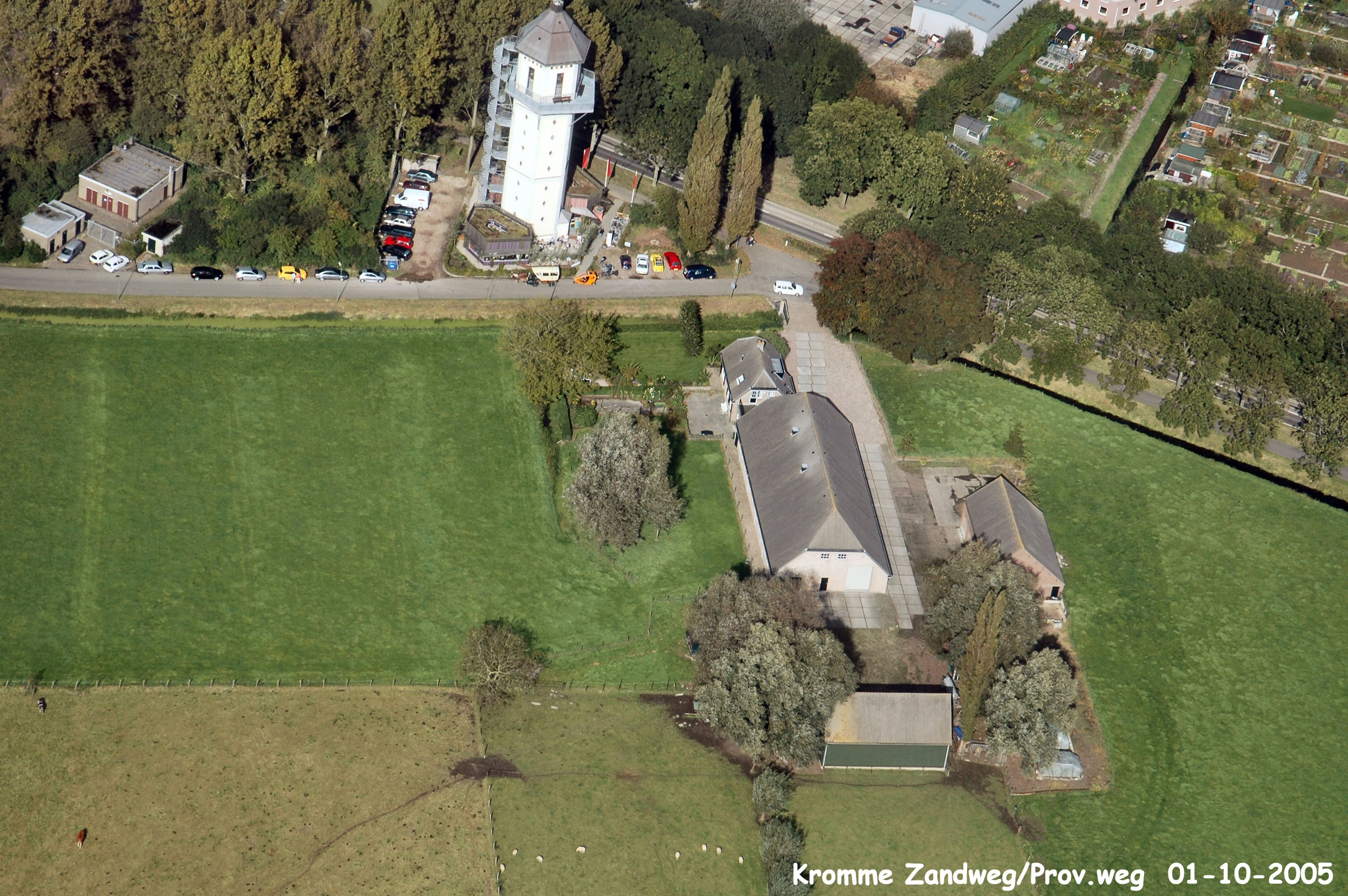 Watertoren en boerderij Merwezicht aan de Kromme Zandweg met de Provincialeweg er achter.
