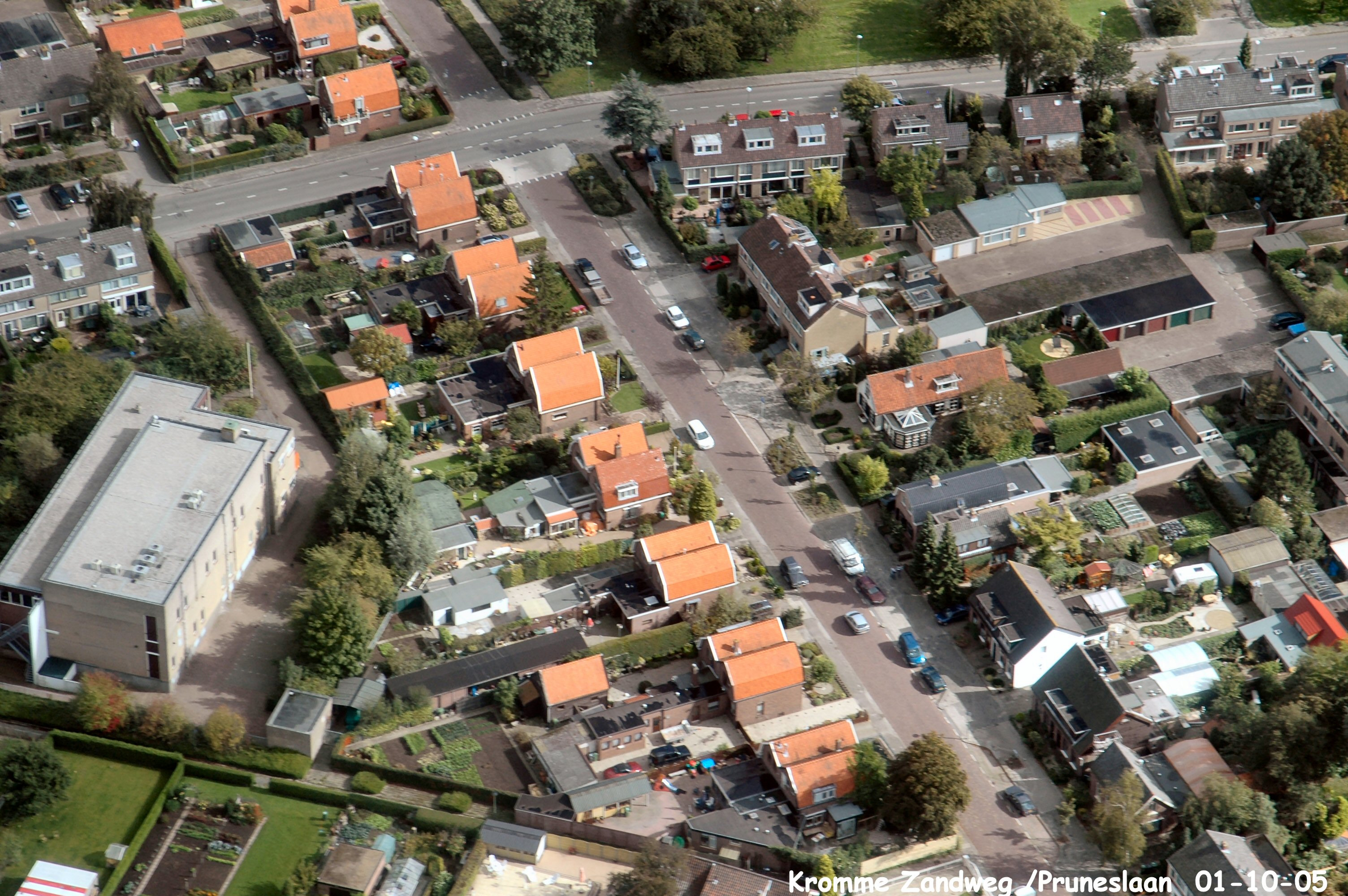Rechts onder naar boven is de Kromme Zandweg met boven de Prunuslaan. gezien in Oostelijke richting.