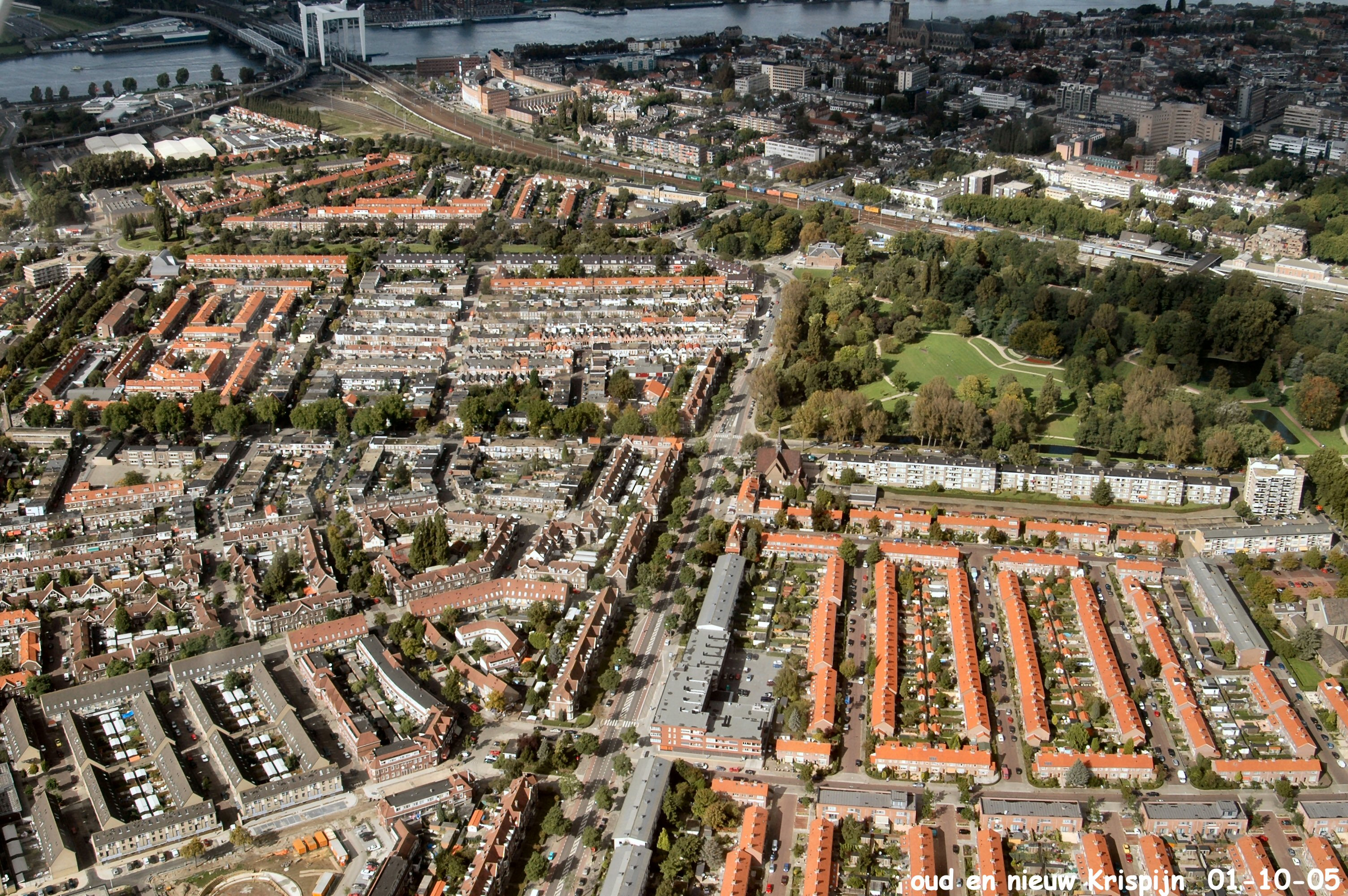 Oud en Nieuw krispijn met het Weizigt Park, Links boven de spoor en verkeersbrug over de Oude Maas. gezien in Noord/Westelijke richting.
