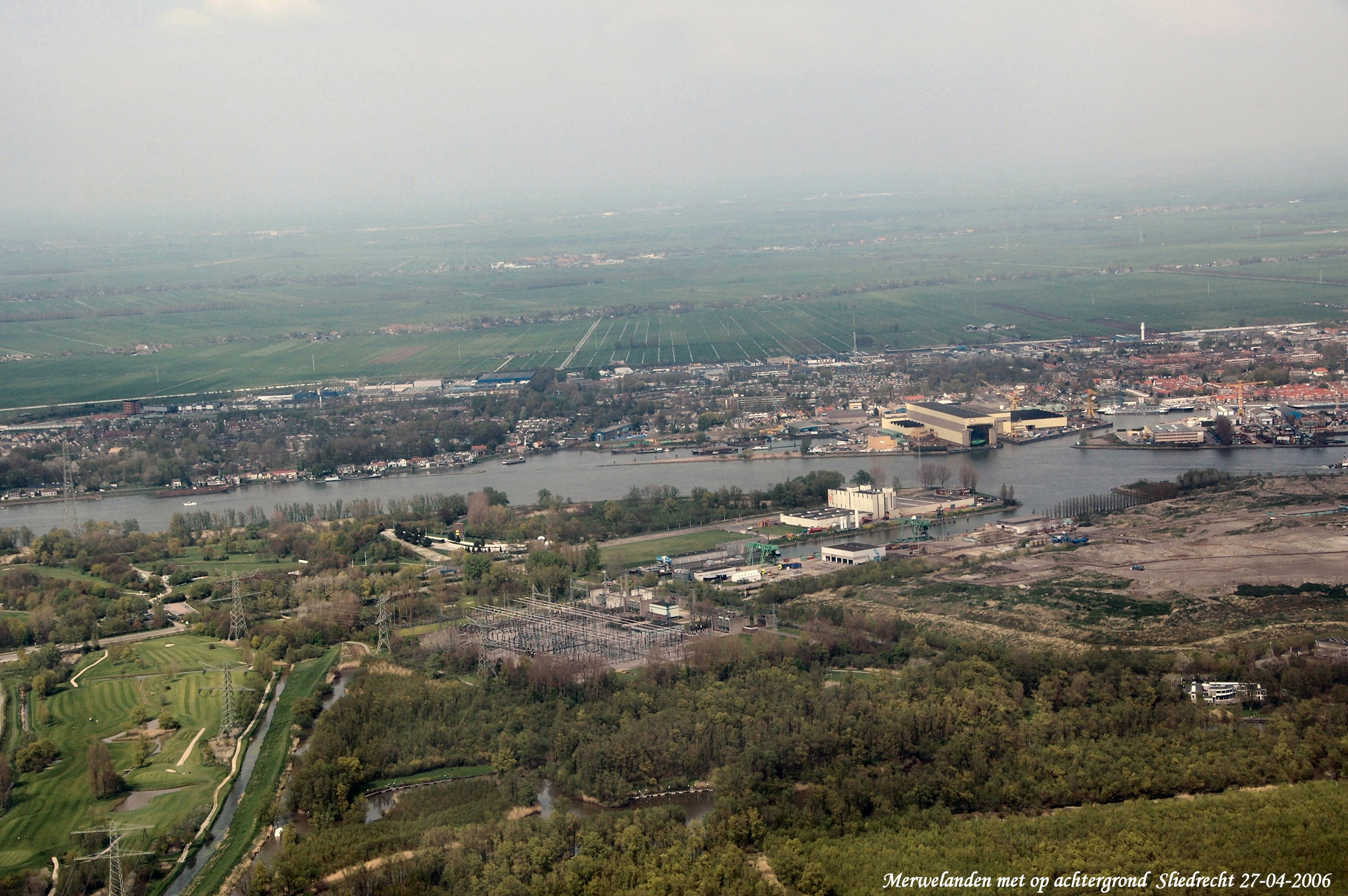 Merwelanden met Sliedrecht op de achtergrond. Er tussen is de Beneden Merwede.