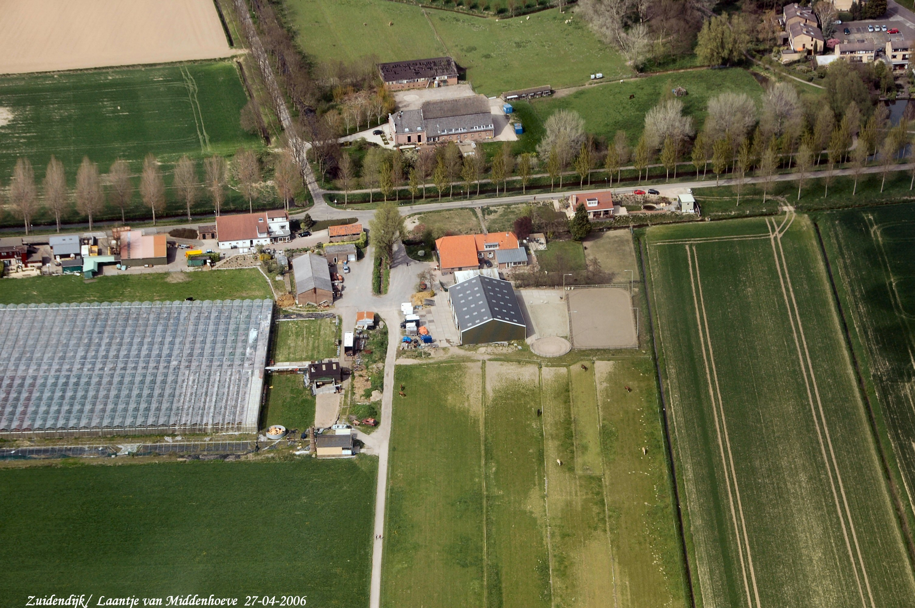 Zuidendijk met midden boven boerderij Middenhoeve. Links onder de voormalige kassen van Valks groenteteelt.