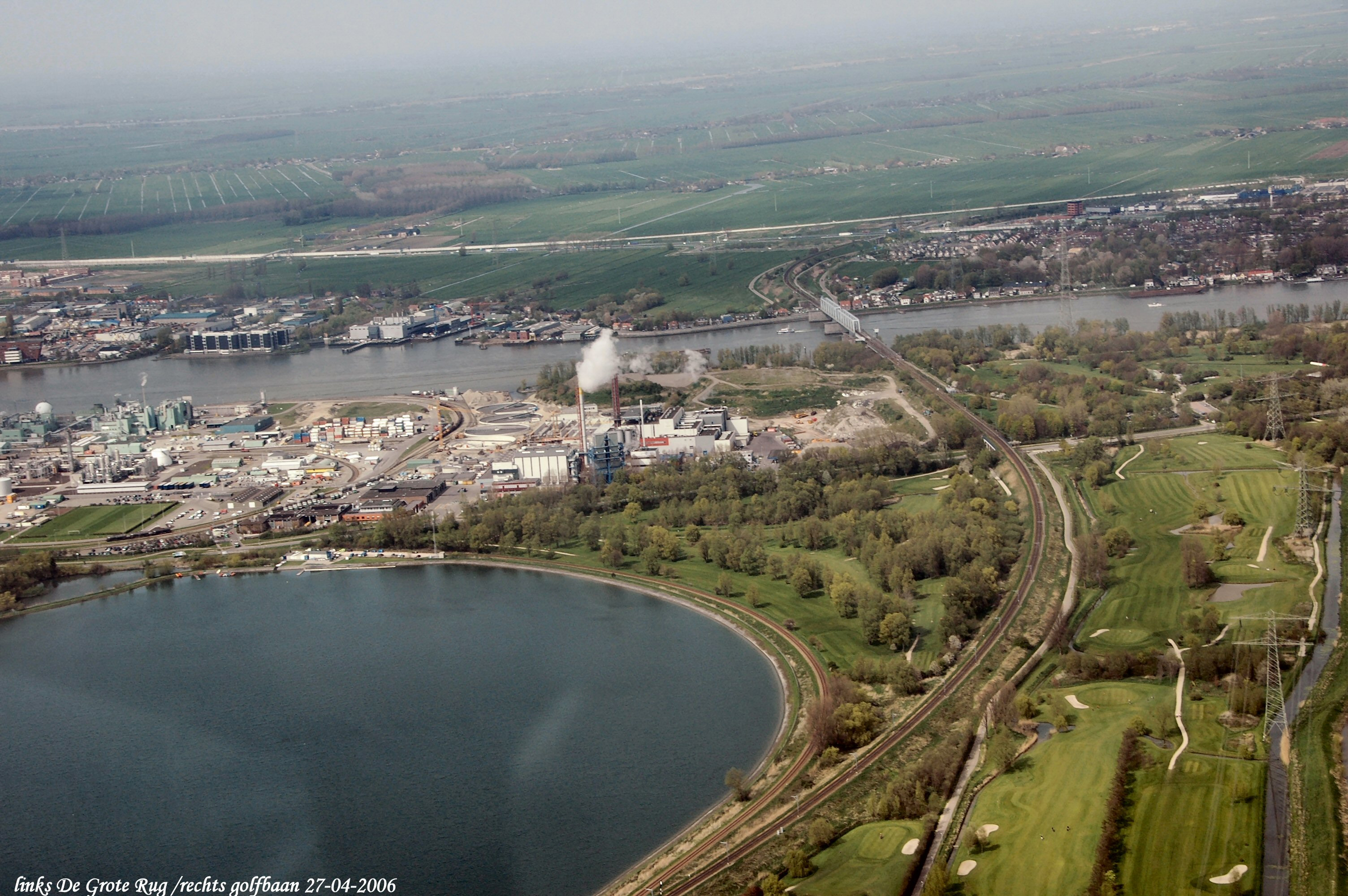 Links onder waterbekken "Grote Rug" Rechts spoorlijn Dordrecht-Sliedrecht. Boven de Alblasserwaard met de A15 en de Beneden Merwede er onder.Midden links is de Staart