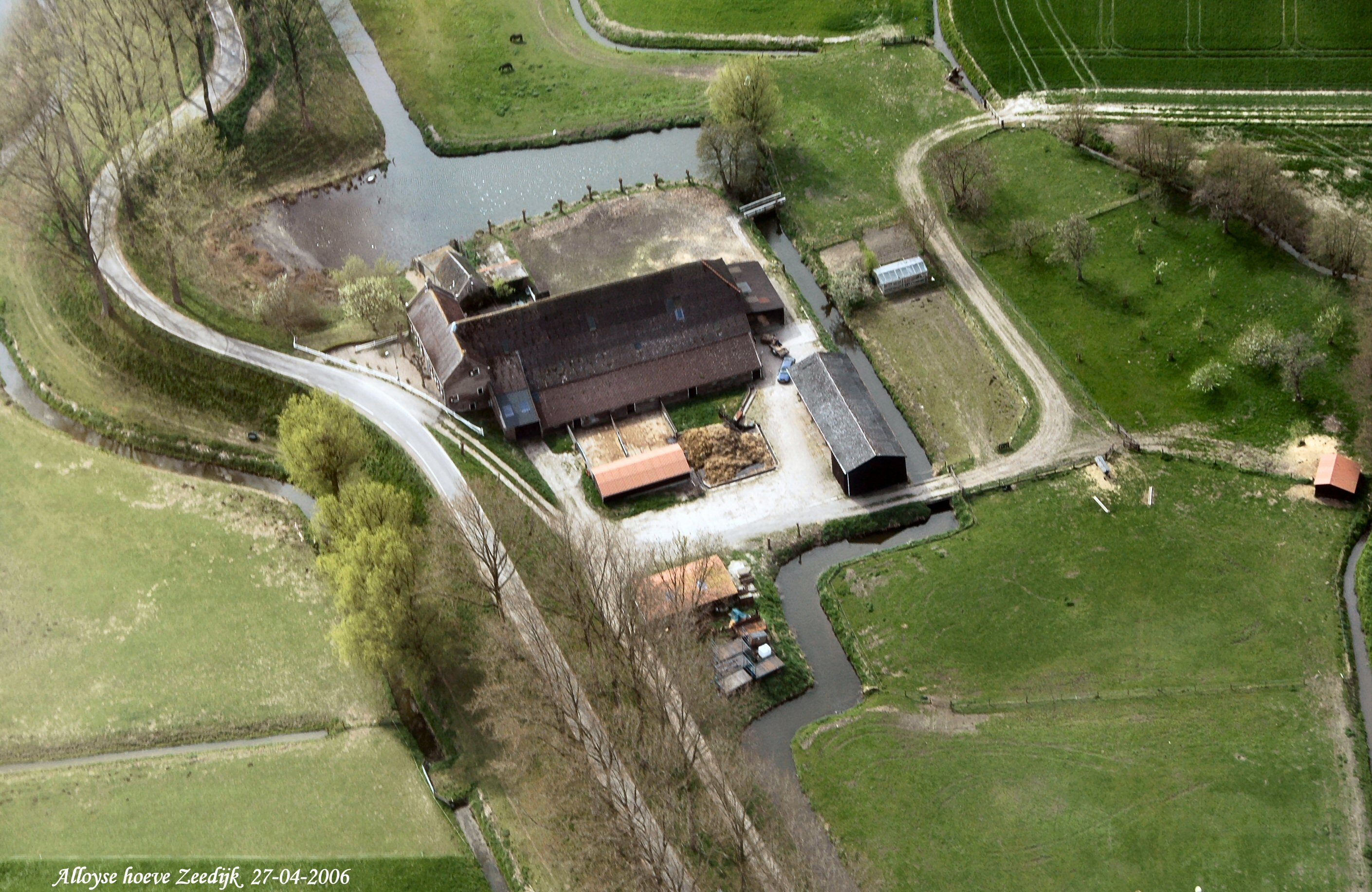 Alloyse hoeve aan de Zeedijk met er naast een oude dijk doorbraak. gezien in Westelijke richting.