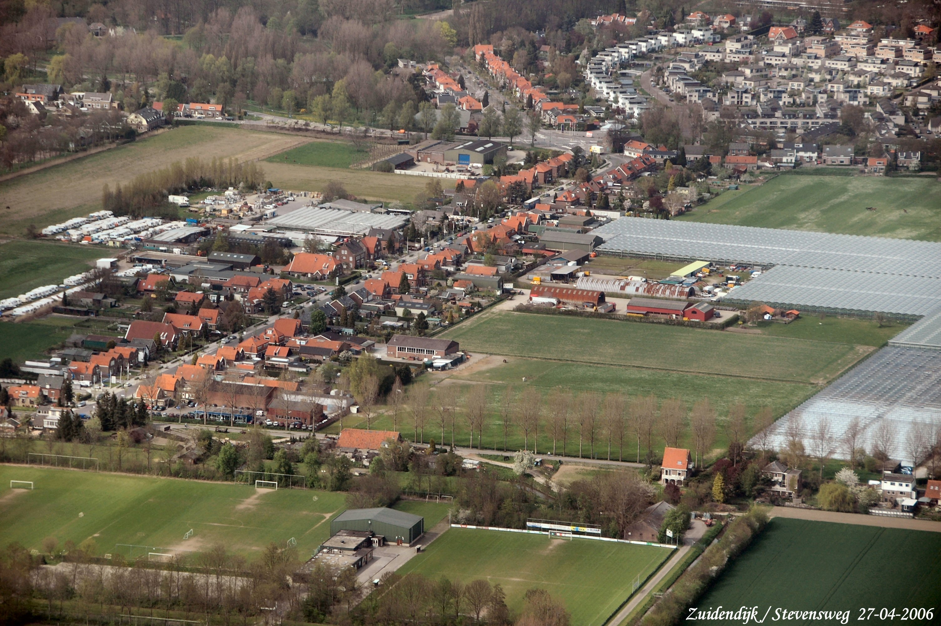 Onder is de Zuidendijk met haaks er op de Stevensweg. Rechts boven Burg.Beelaertspark. Midden boven naar rechts is de Oudendijk met halverwege de Burg.Jaslaan naar boven. gezien in Noord/Westelijke richting.
