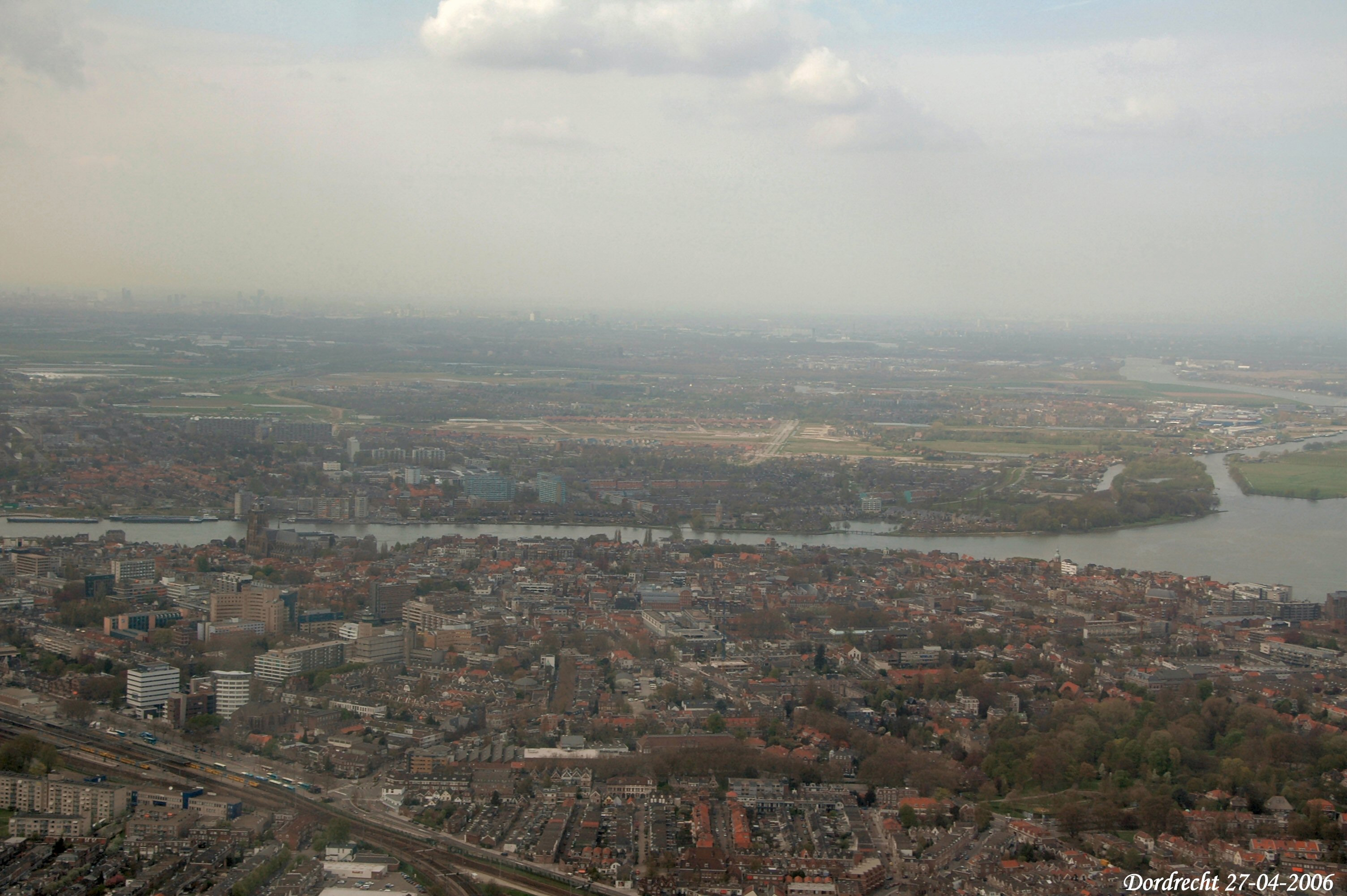 Dordrecht met Zwijndrecht er boven en de Oude Maas er tussen gezien in Noord/Westelijke richting.