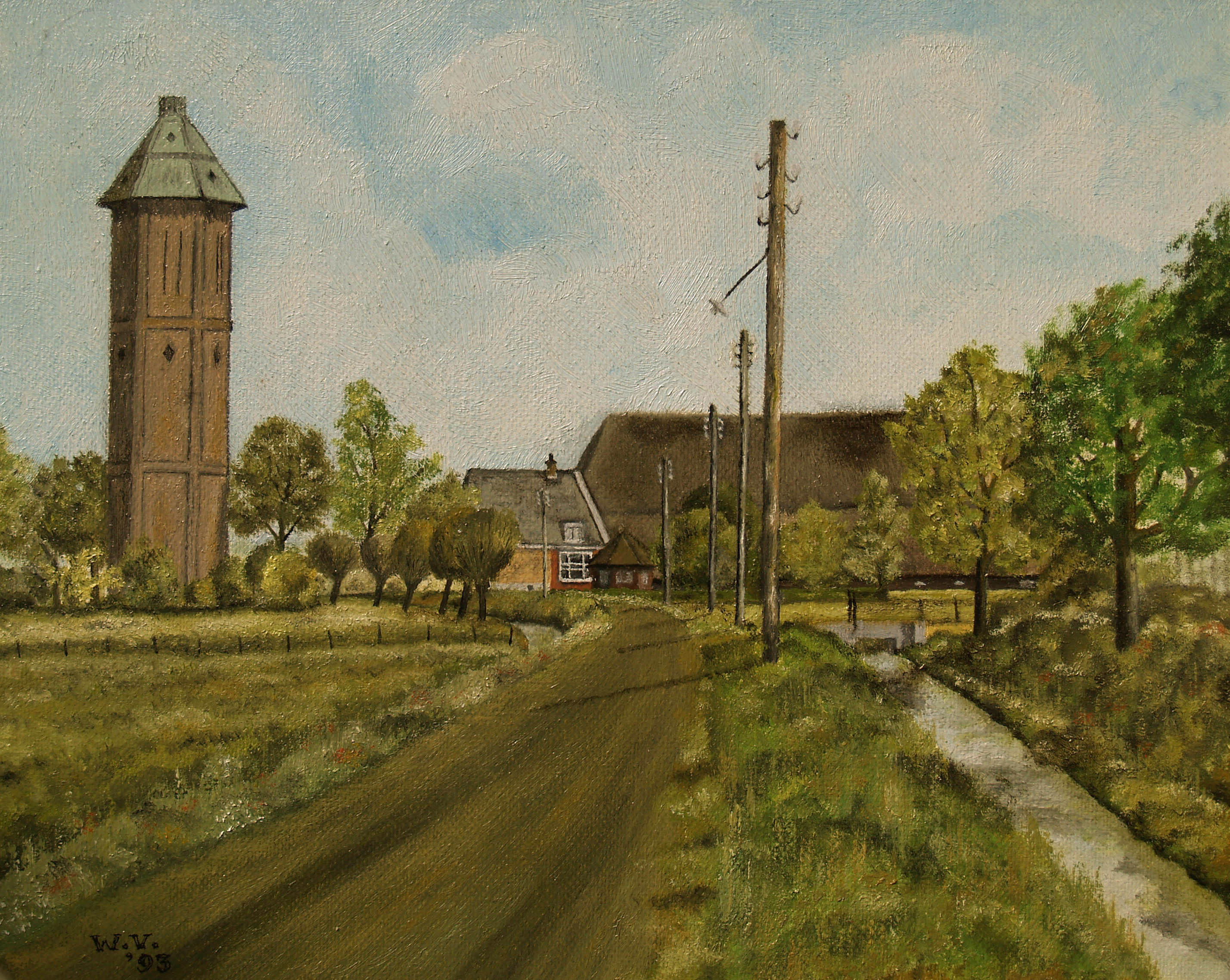 Kromme Zandweg met de watertoren van Dubbeldam, rechts er van de Hoeve "Merwedezicht" gezien in Oostelijke richting.