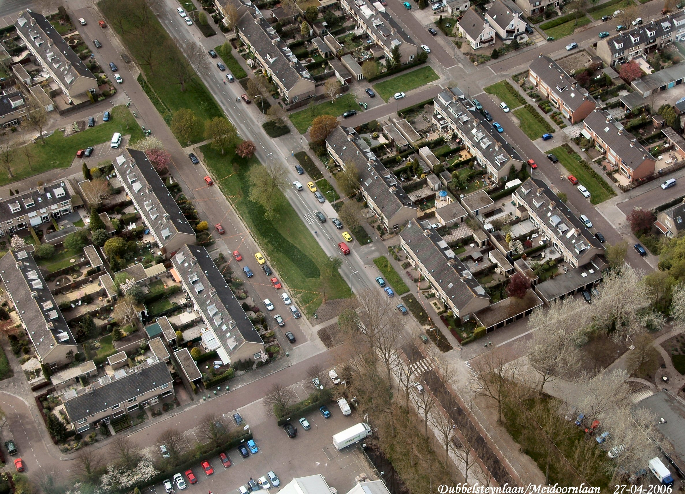 Rechts onder naar links boven is de Dubbelsteynlaan. Links onder is de Lindelaan. Midden rechts naar boven is de Meidoornlaan. gezien in Noord/Westelijke richting.