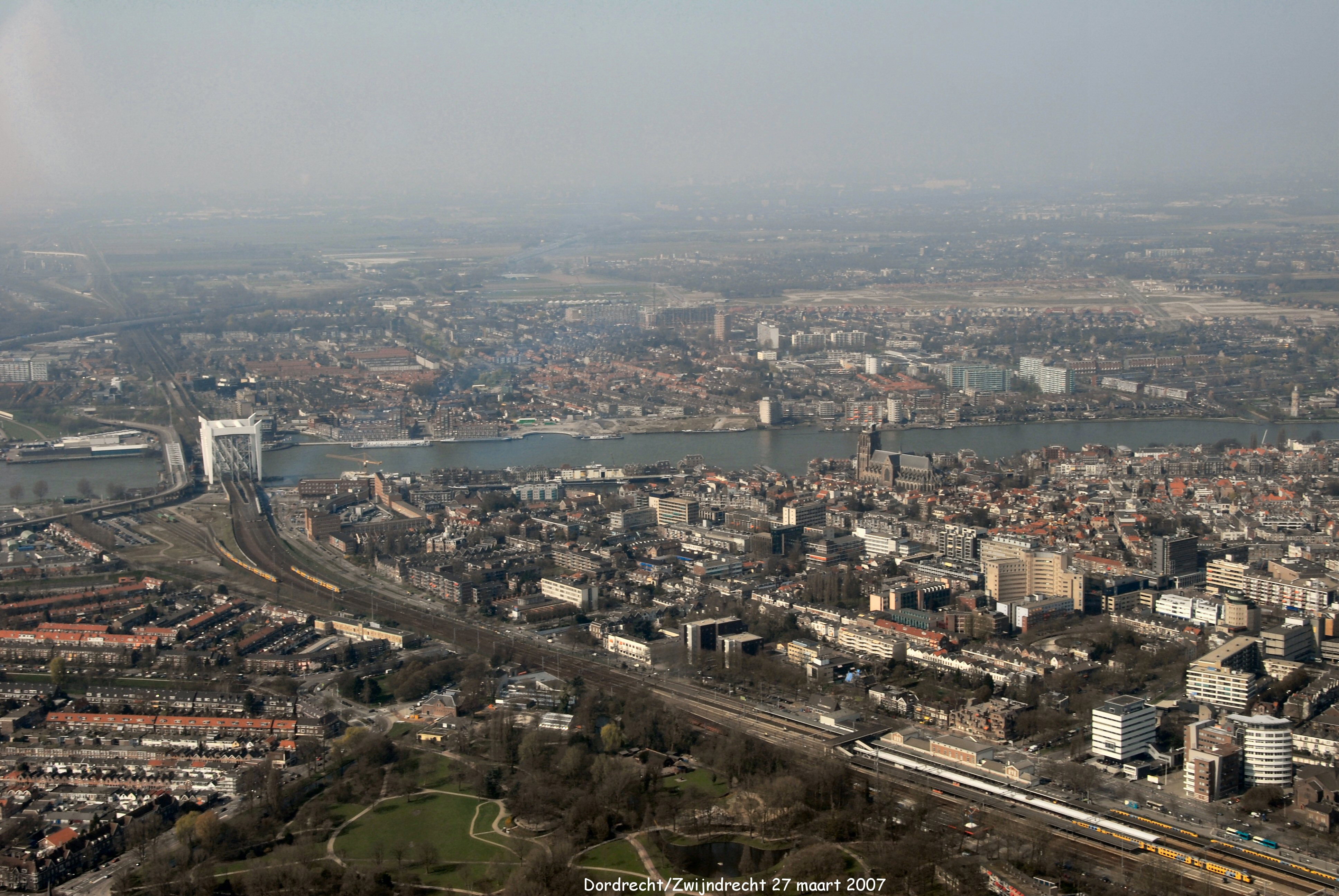 Midden onder is het Weizigtpark met in het midden de Oude Maas. |Rechts onder is het Station van Dordrecht. Boven op de achtergrond is Zwijndrecht.