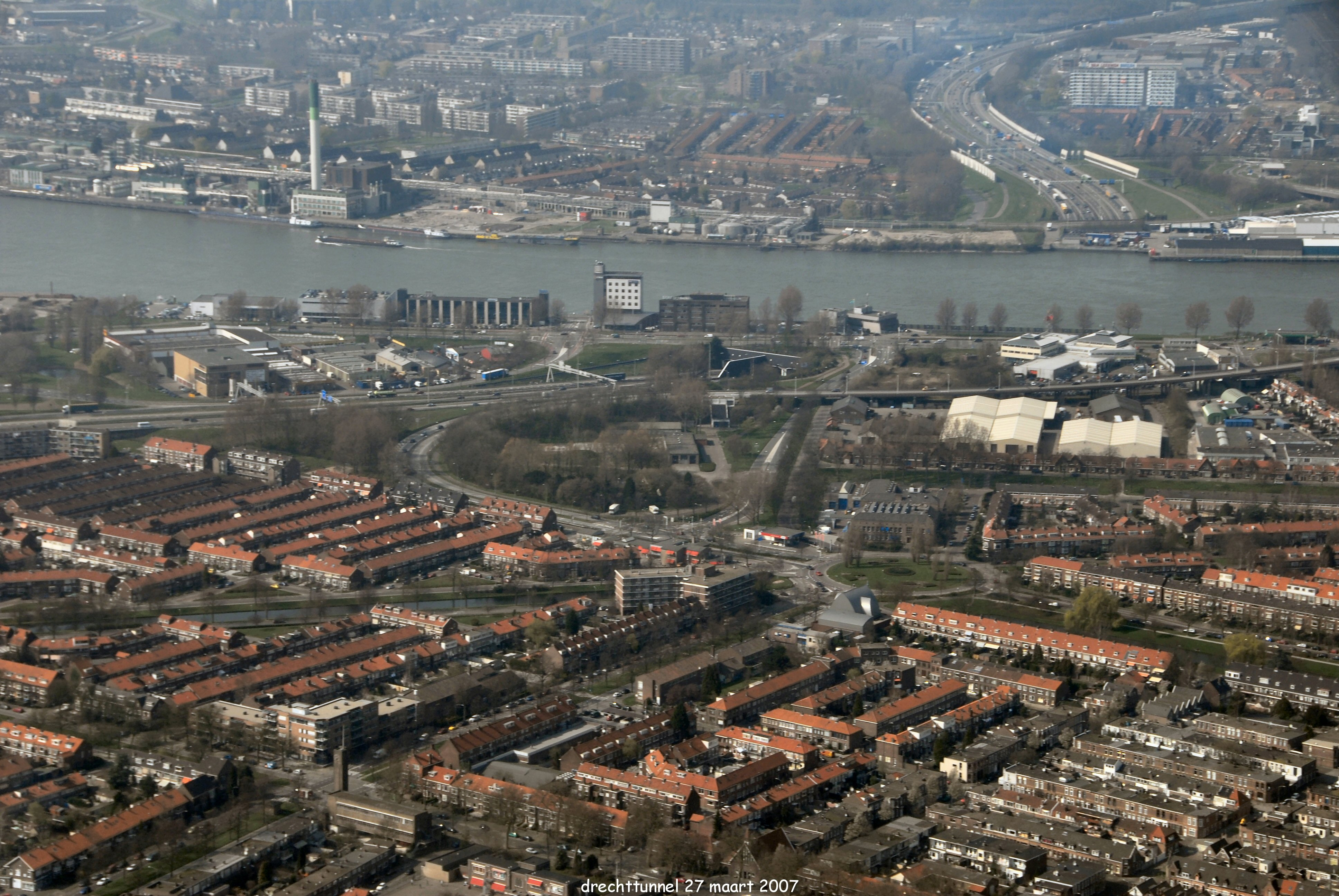 Oude Maas met Zwijndrecht er boven. Midden links is de A16 naar de Drechttunnel. Onder is Krispijn. gezien in Westelijke richting.