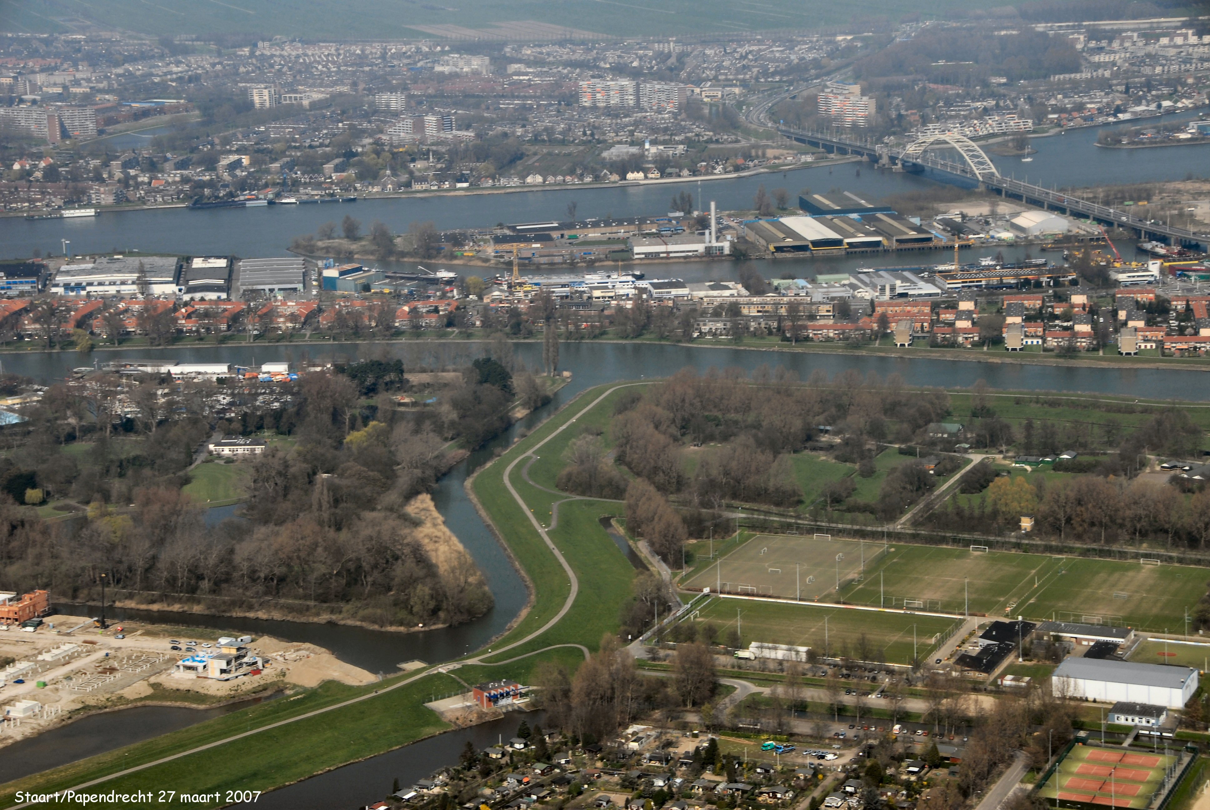 Links onder is plan Tij. Midden links naar rechts is het Wantij met de Staart er boven. Rechts boven is de |Merwedebrug. geheel boven is papendrecht. gezien in Noord/Oostelijke richting.