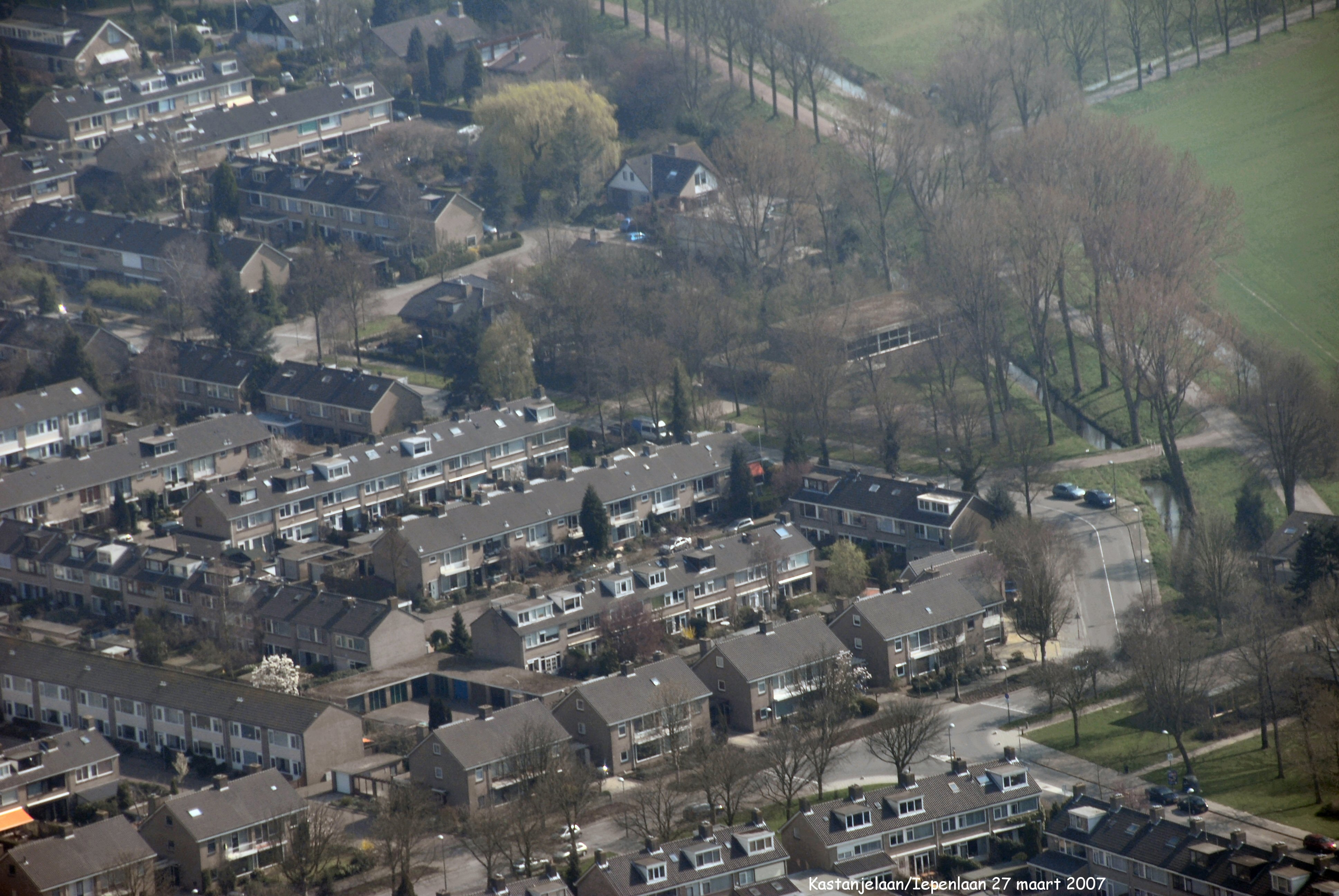 Midden rechts is de Oudendijk met haaks er op Laantje van Middenhoeve. Rechts onder naar rechts is de Eikenlaan. Midden links naar rechts is de iepenlaan. gezien in Zuid/Oostelijke richting.
