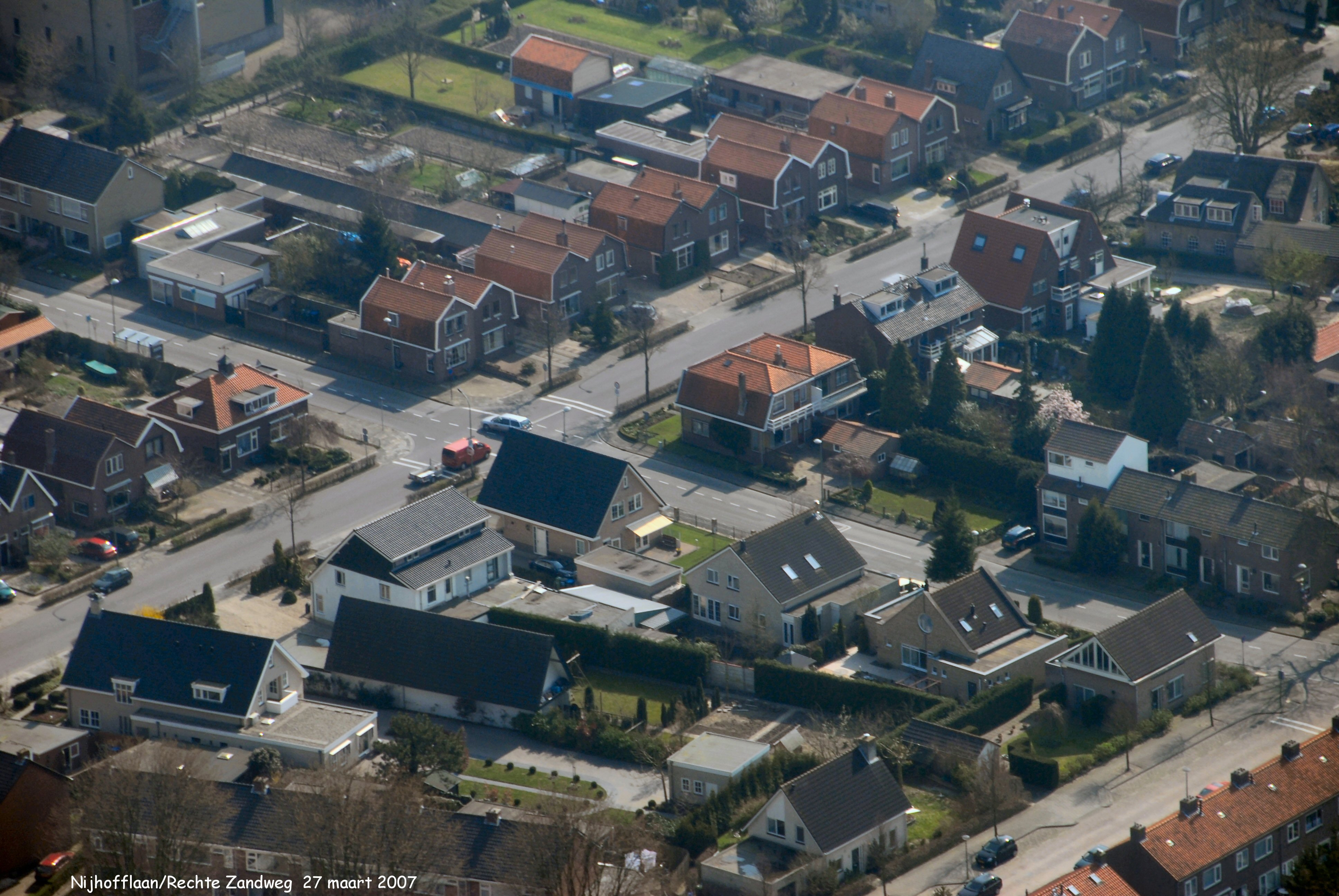 Links onder naar boven is de Rechte Zandweg. Rechts onder de van Deysselstraat. Van links naar rechts is de Prunuslaan overgaand in de Nijhofflaan. gezien in Zuid/Oostelijke richting.