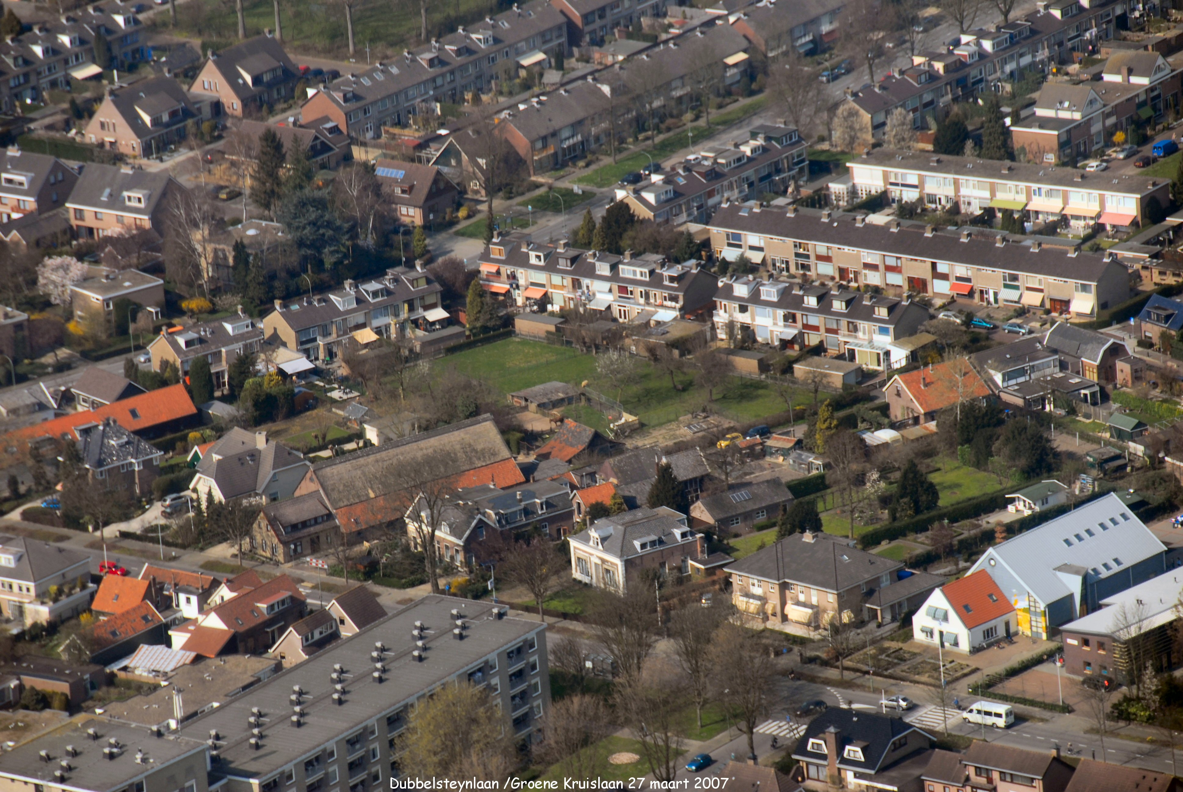 Links onder is "Gravenhorst" Rechts onder naar links is de Dubbelsteynlaan. Mid links naar rechts boven is de Groene Kruislaan gezien in Noord/Westelijke richting.