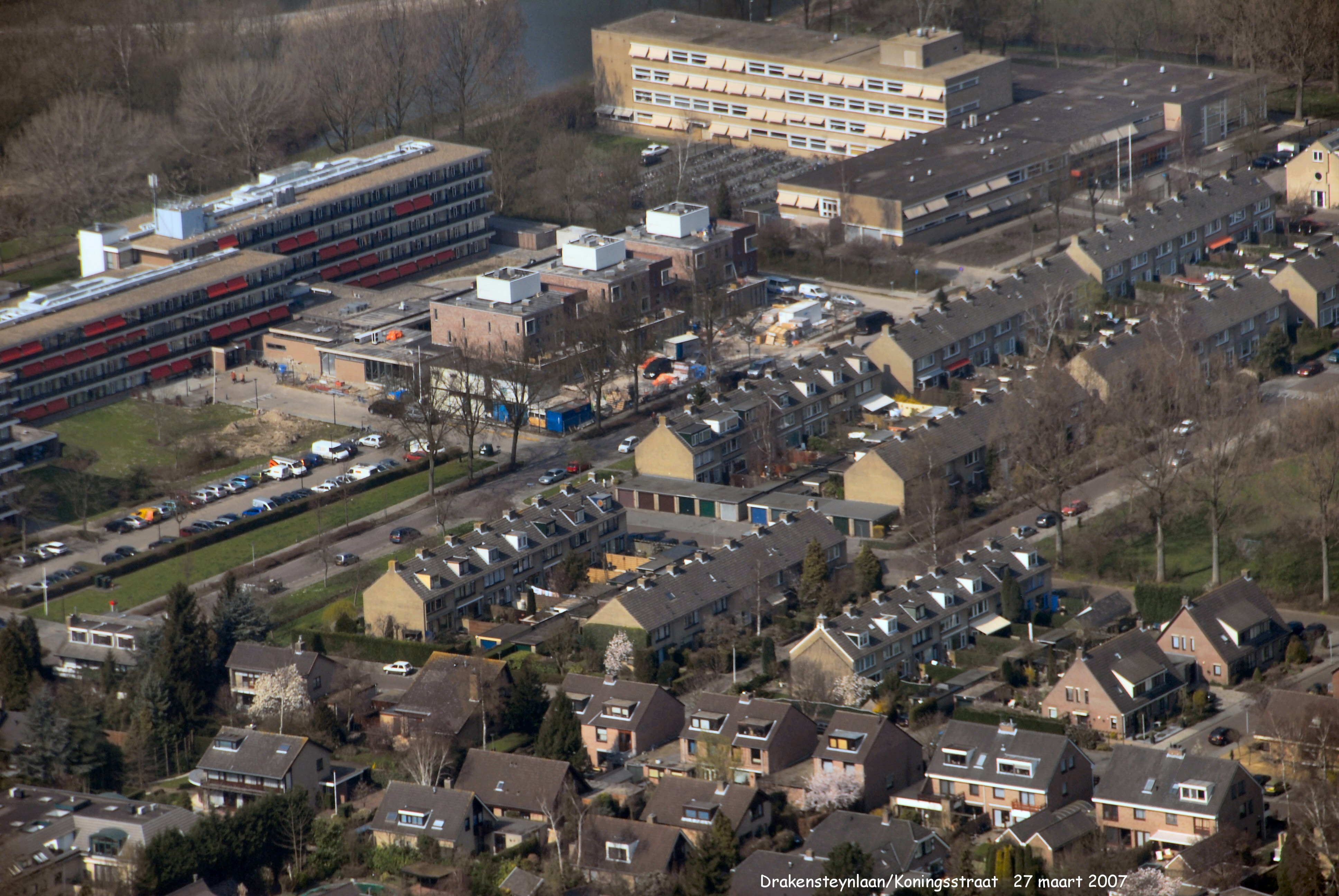 Onder is de Drakensteynlaan. Rechts boven is Dubbelmonde aan de Koningstraat met het Insula College er naast. gezien in Noord/Westelijke richting.