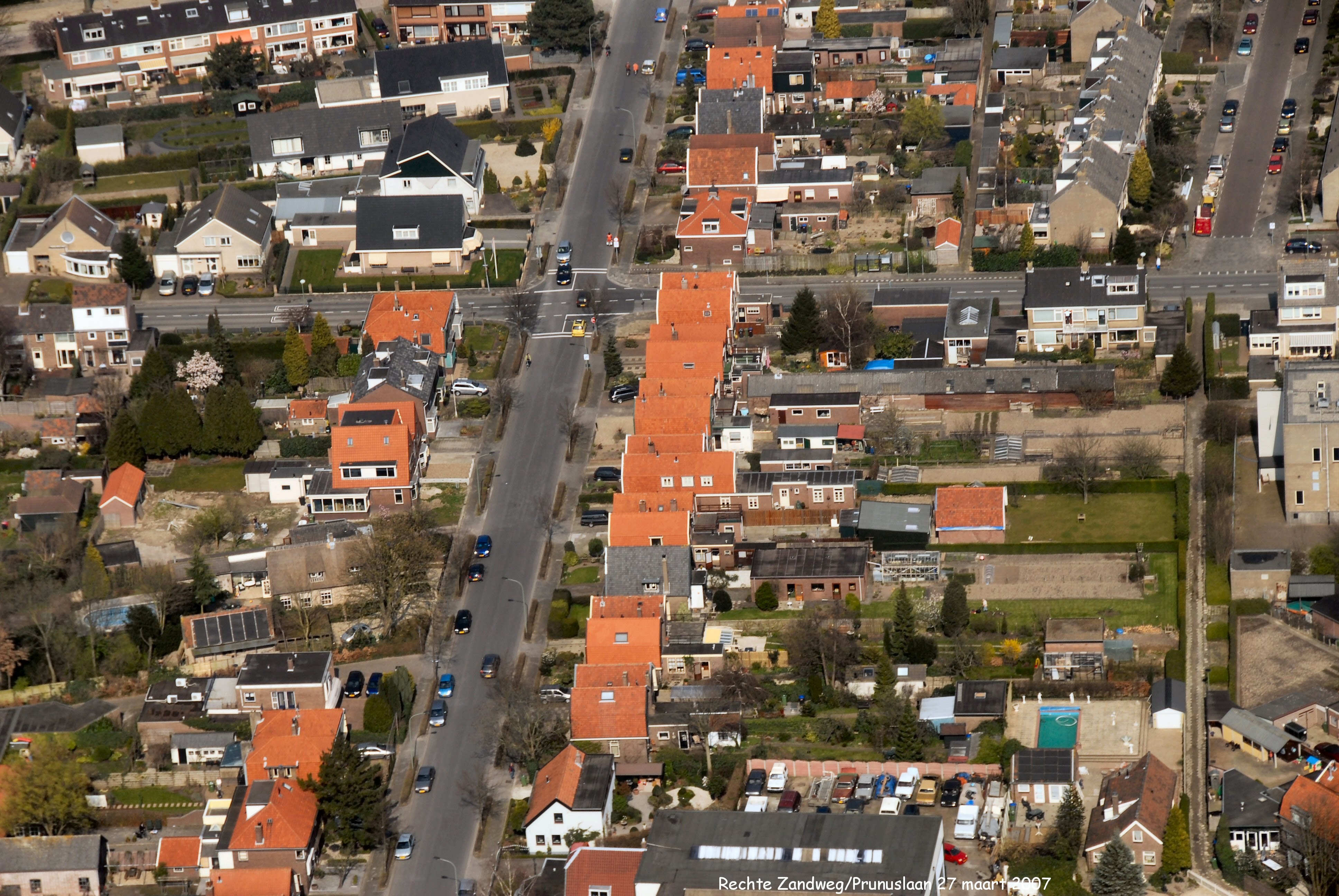 Onder naar boven is de Rechte Zandweg met midden links de Prunuslaan welke rechts overgaat in de Nijhofflaan. Rechts boven is de Van Deysselstraat gezien in Zuidelijke richting.
