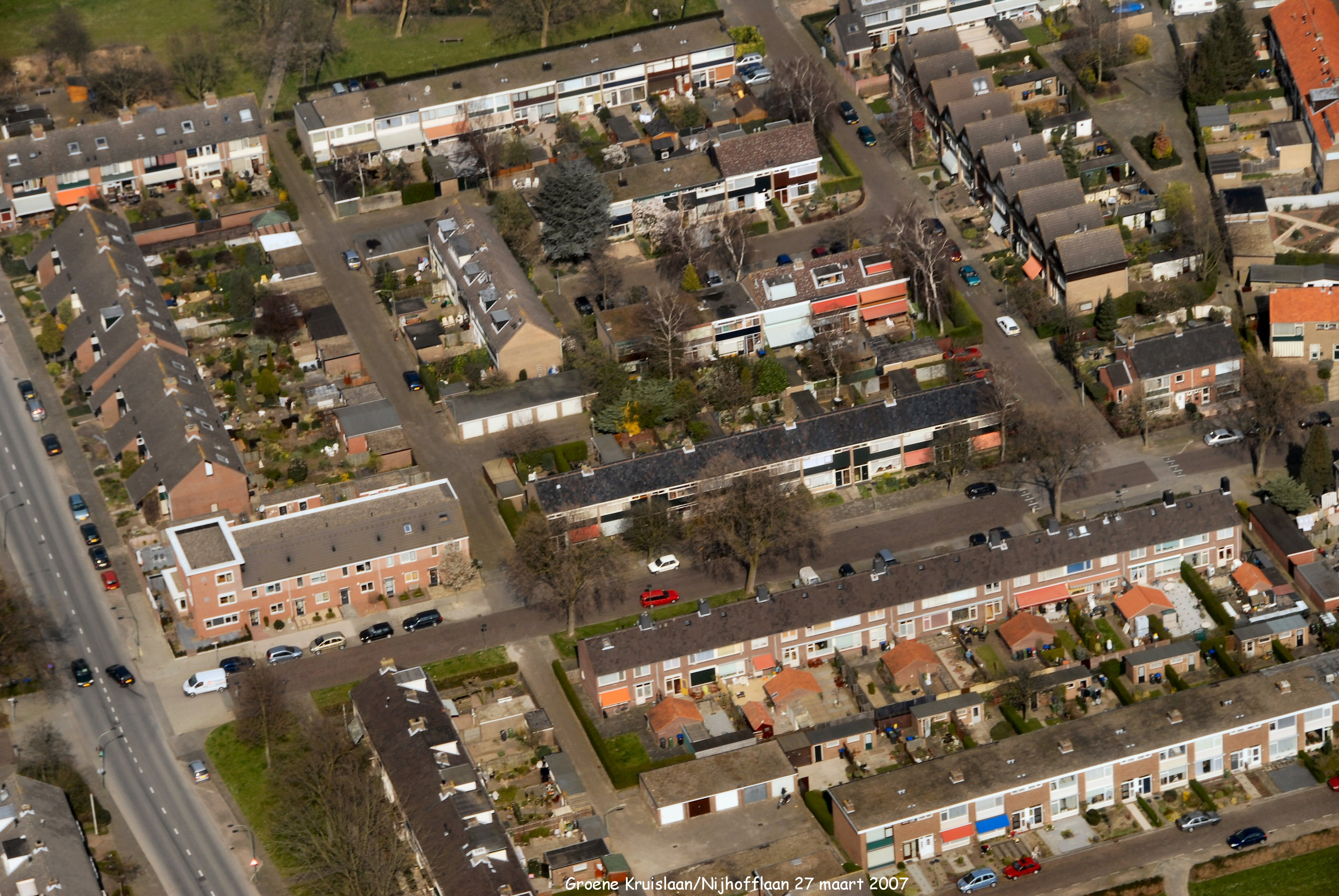 Mid boven naar onder is de Heijermansstraat. Links onder naar boven is de Groene Kruislaan. Links onder naar rechts is de Damstraat. gezien in Noordelijke richting.