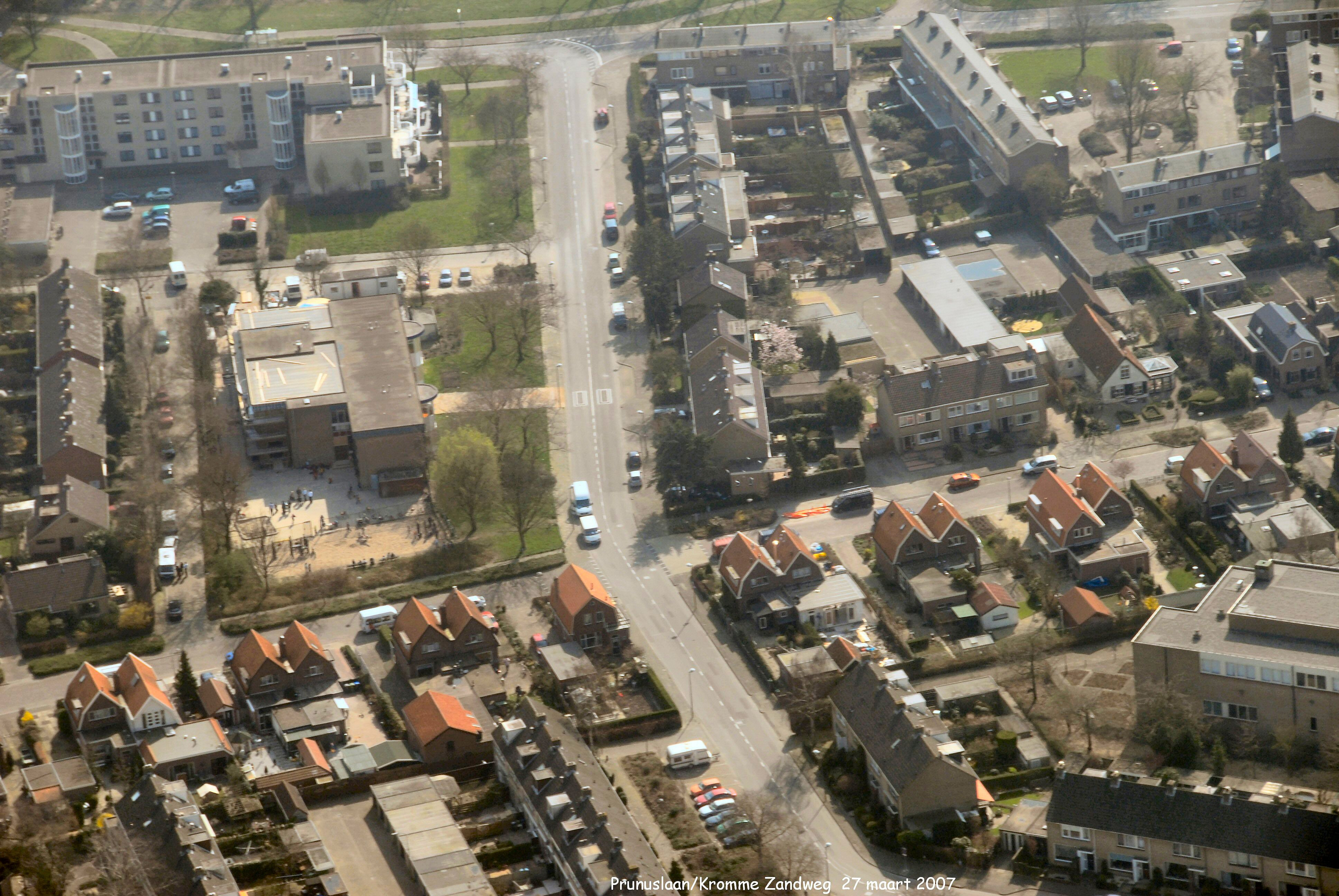 Boven is de Dubbelsteynlaan Oost. Midden onder naar boven is de Prunuslaan. Midden rechts naar links is de kromme Zandweg gezien in Zuidelijke richting.