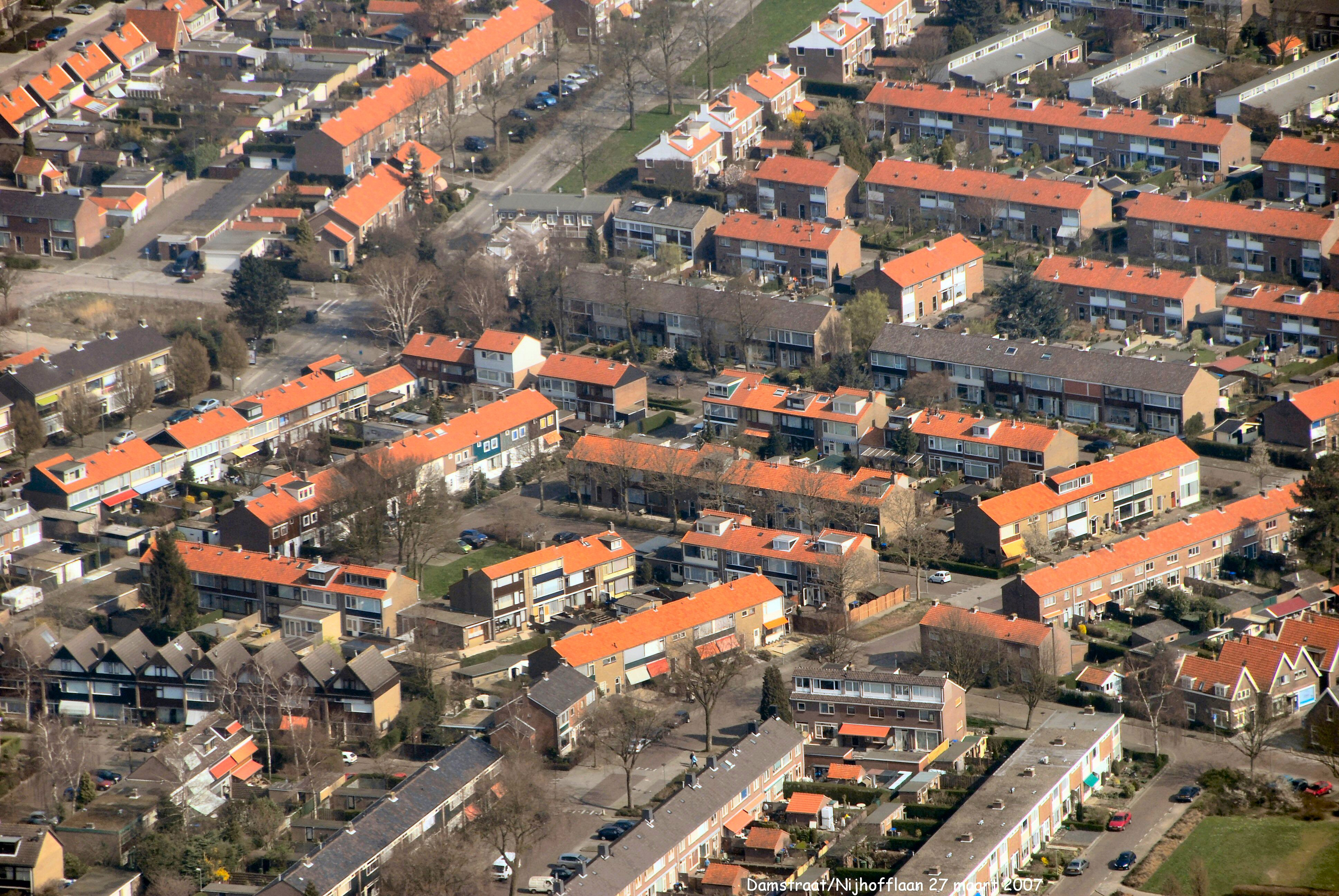 Rechts onder is de Couperusstraat. Midden rechts naar mid onder is de Damstraat. Mid.boven naar onder is de Nijhofflaan. gezien in Noord/Oostelijke richting.