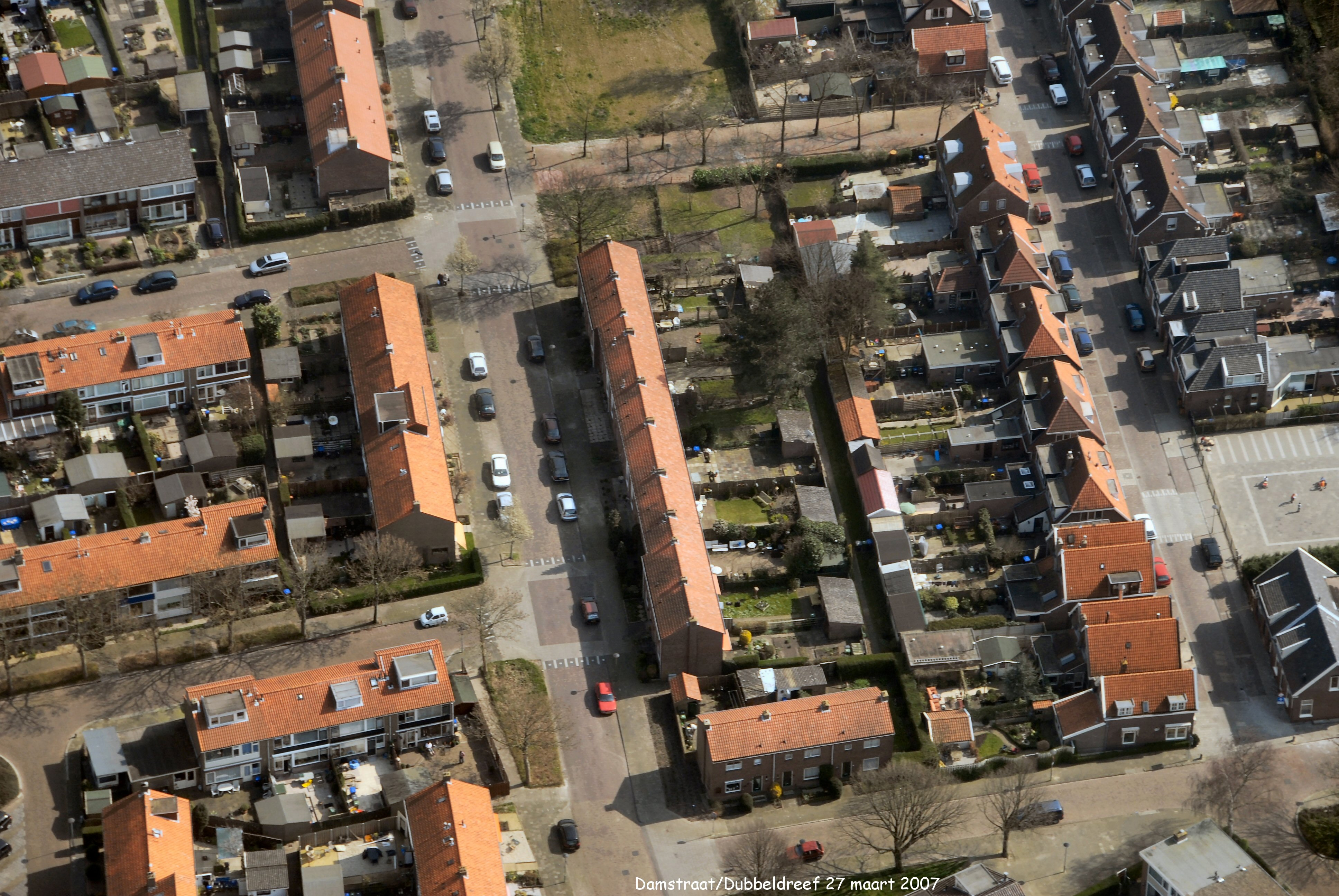 Midden onder naar boven is de Damstraat met rechts de Dubbeldreef. gezien in Oostelijke richting.