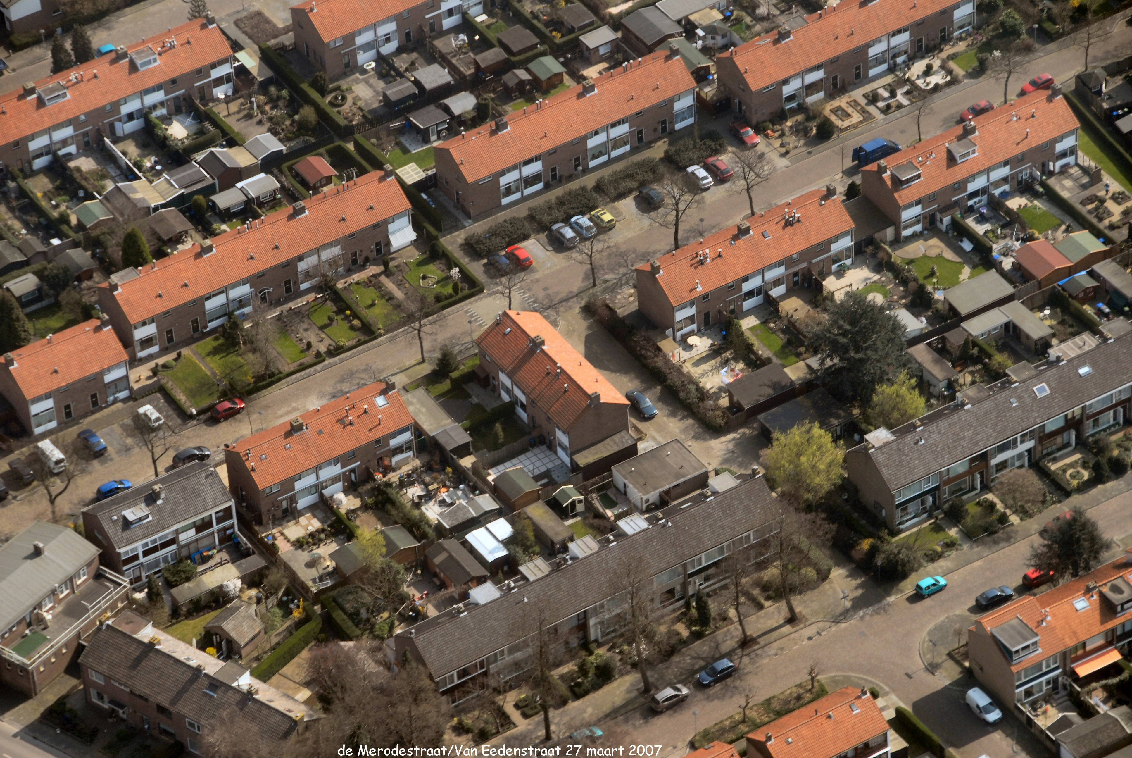 Midden onder naar rechts is de Van Eedenstraat met de Merodestraat er boven gezien in Zuid/Oostelijke richting.
