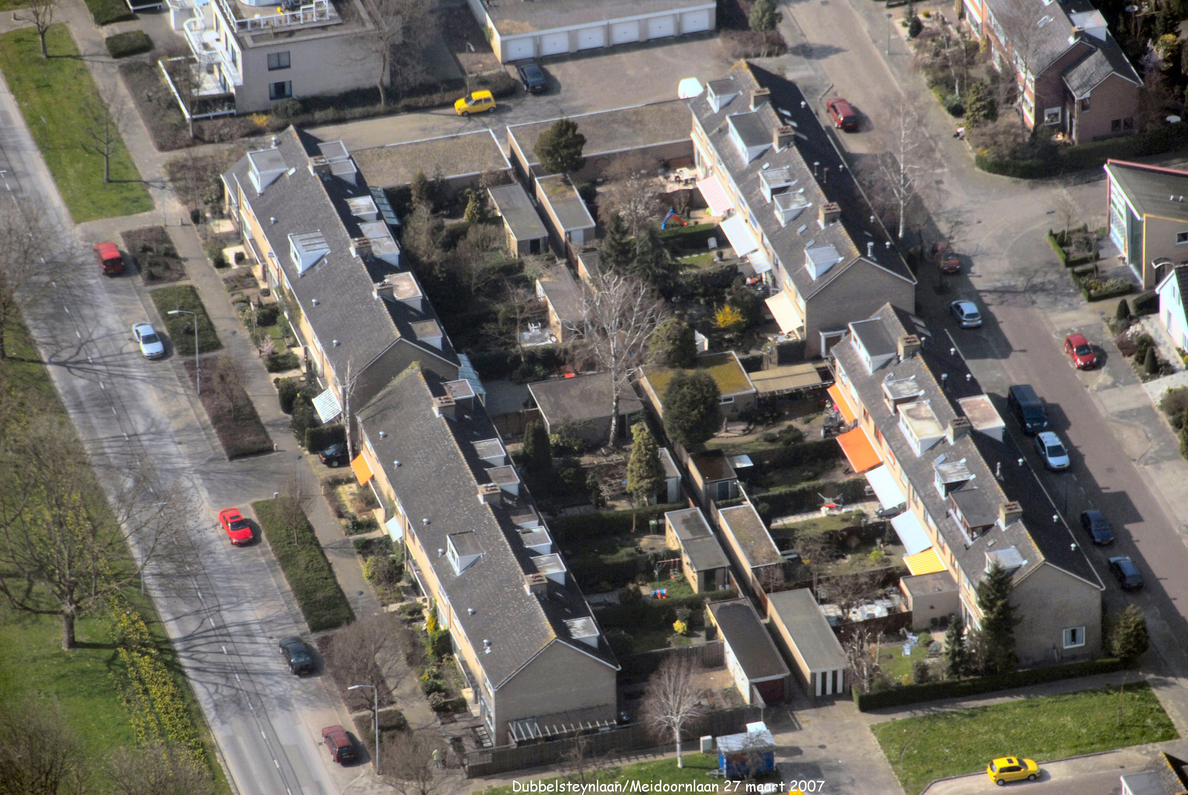 Links is de Dubbelsteynlaan Oost en rechts de Meidoornlaan gezien in Westelijke richting.