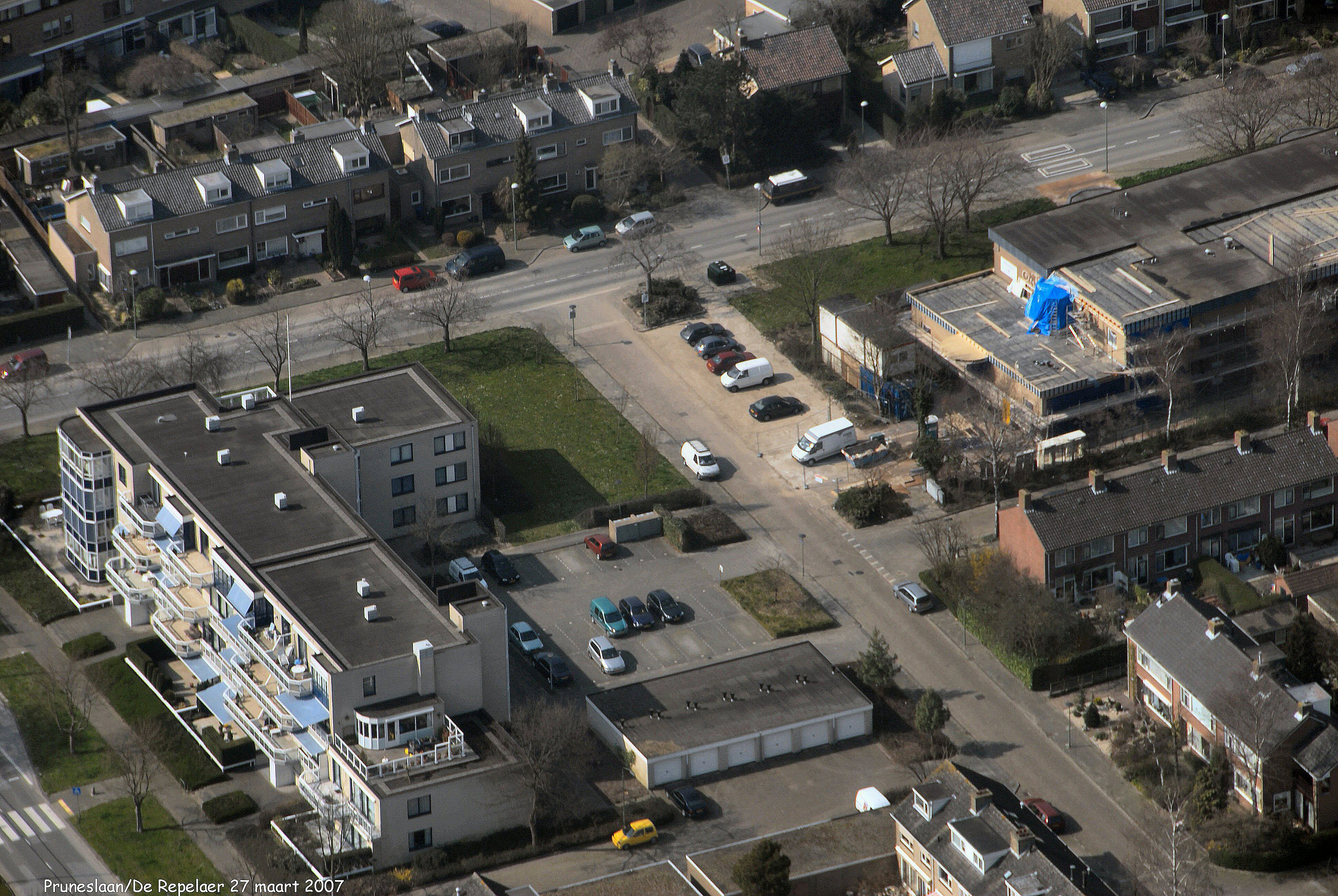 Boven is de Prunuslaan met mid.rechts de Ammanschool aan de Meidoornlaan. Links onder is de Dubbelsteynlaan Oost.met woonflat "De Repelaer" .gezien in Noord/Westelijke richting.