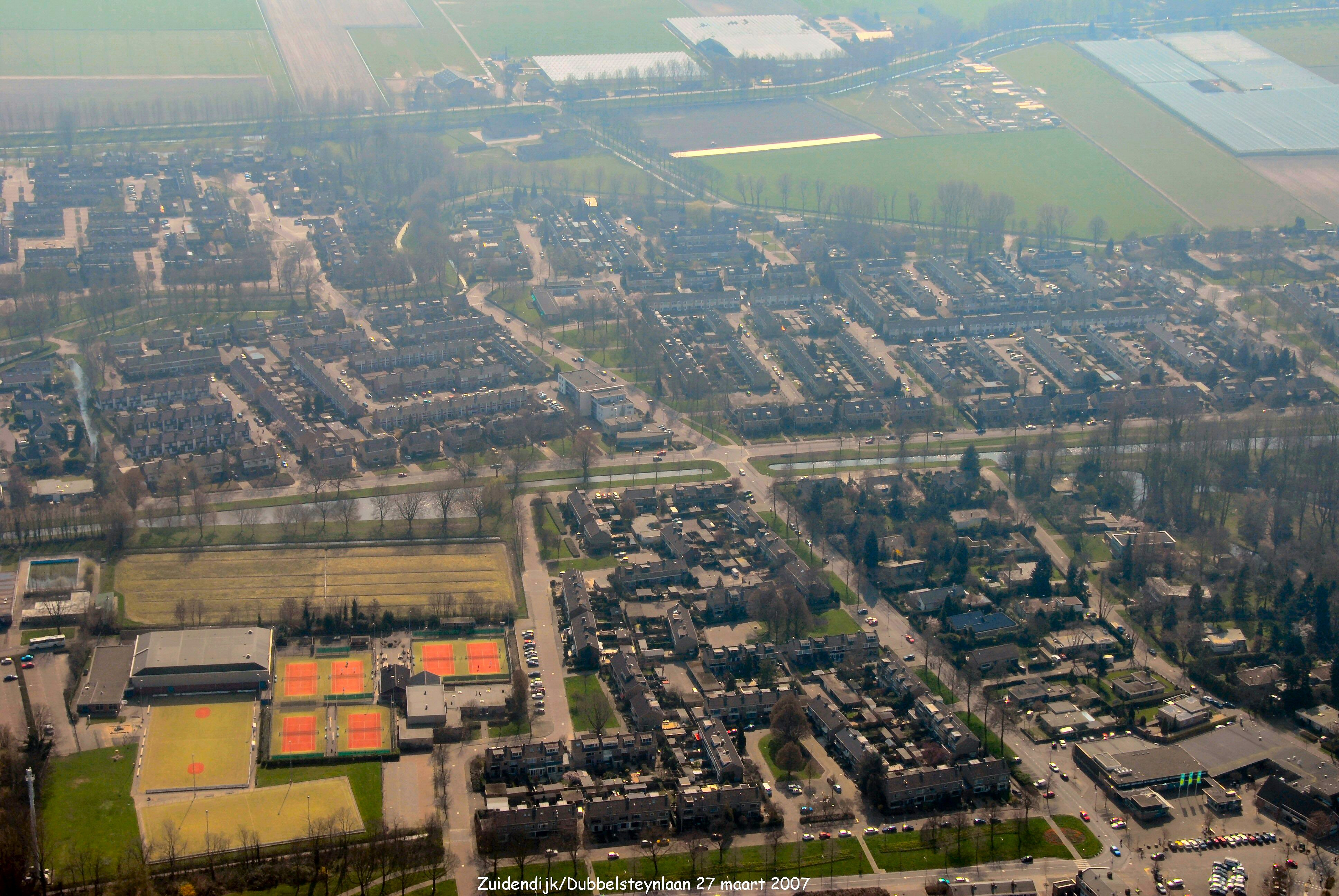 Links onder tennisver. Dubbeldam aan de Esdoornlaan. Midden van links naar rechts is de Gravensingel en geheel boven de Zuidendijk. Rechts onder het Damplein met de Elzenlaan naar boven gezien in Zuidelijke richting.