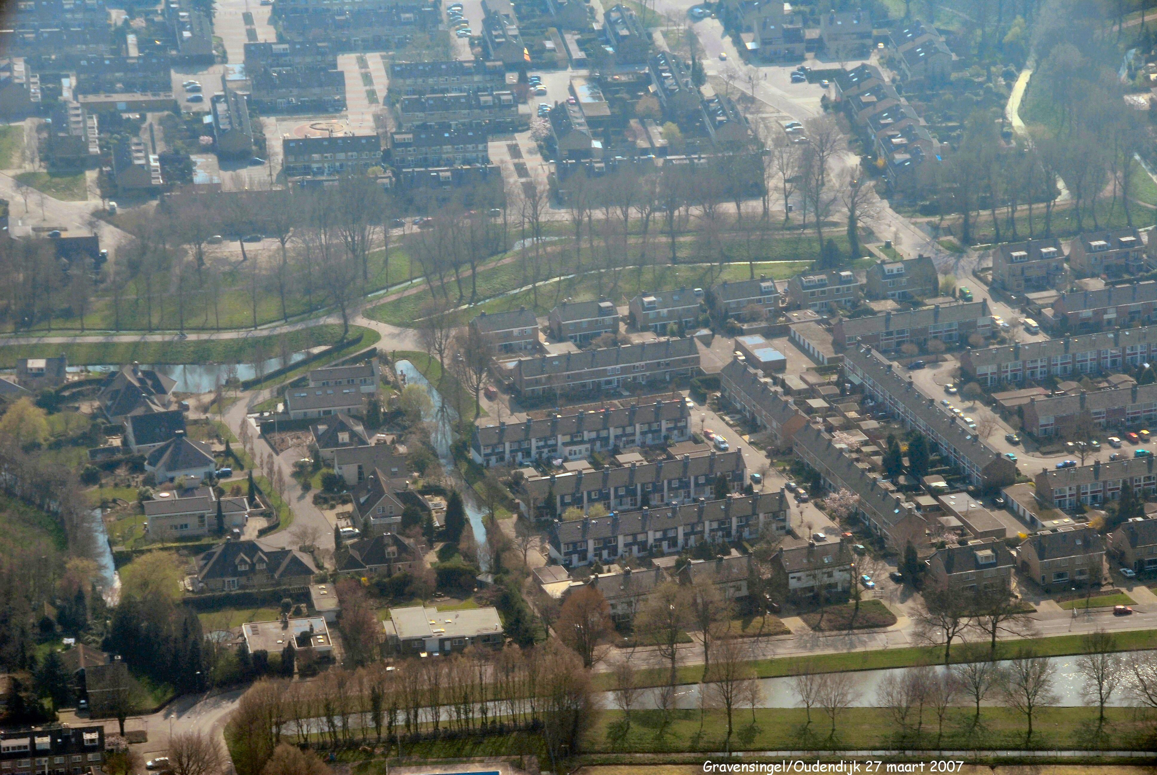 Onder is de Gravensingel. De Oudendijk in het midden van links naar rechts. Boven is Middenhoeve. gezien in Zuidelijke richting.