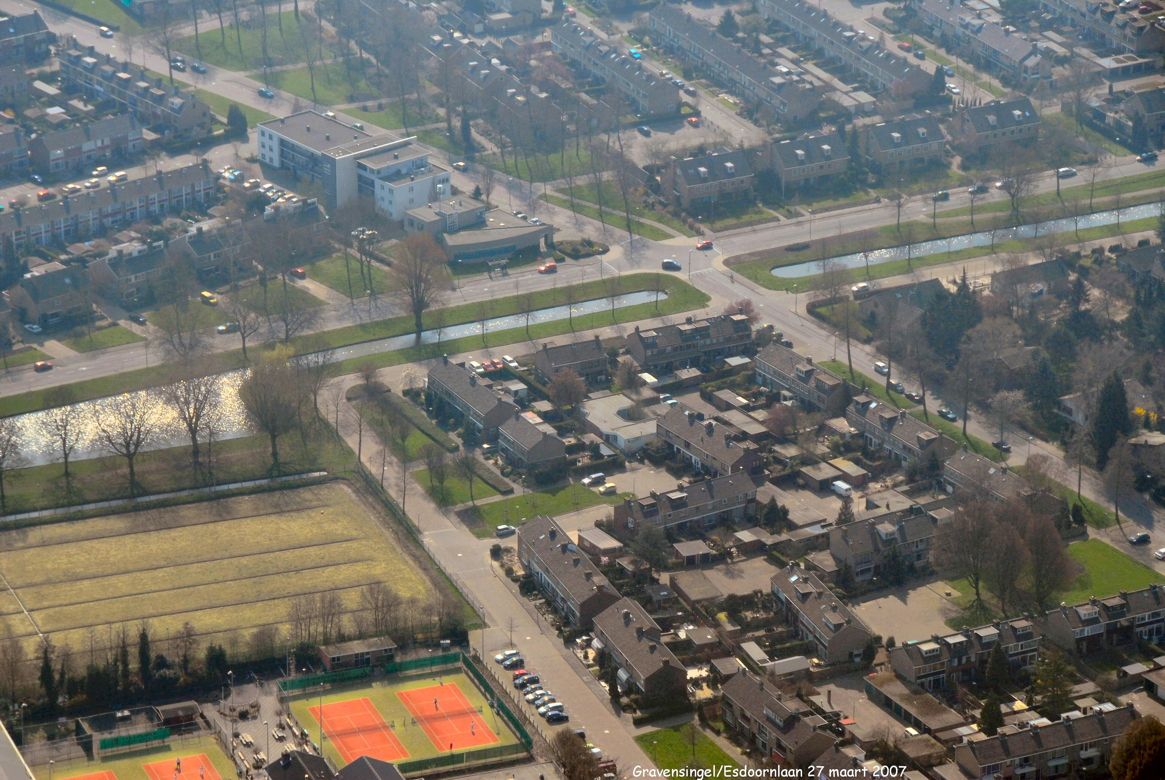 Links onder de tennisver. Dubbeldam aan de Esdoornlaan. In het midden van links naar rechts is de Gravensingel. Links boven naar rechts onder is de Elzenlaan gezien in Zuid/Westelijke richting.