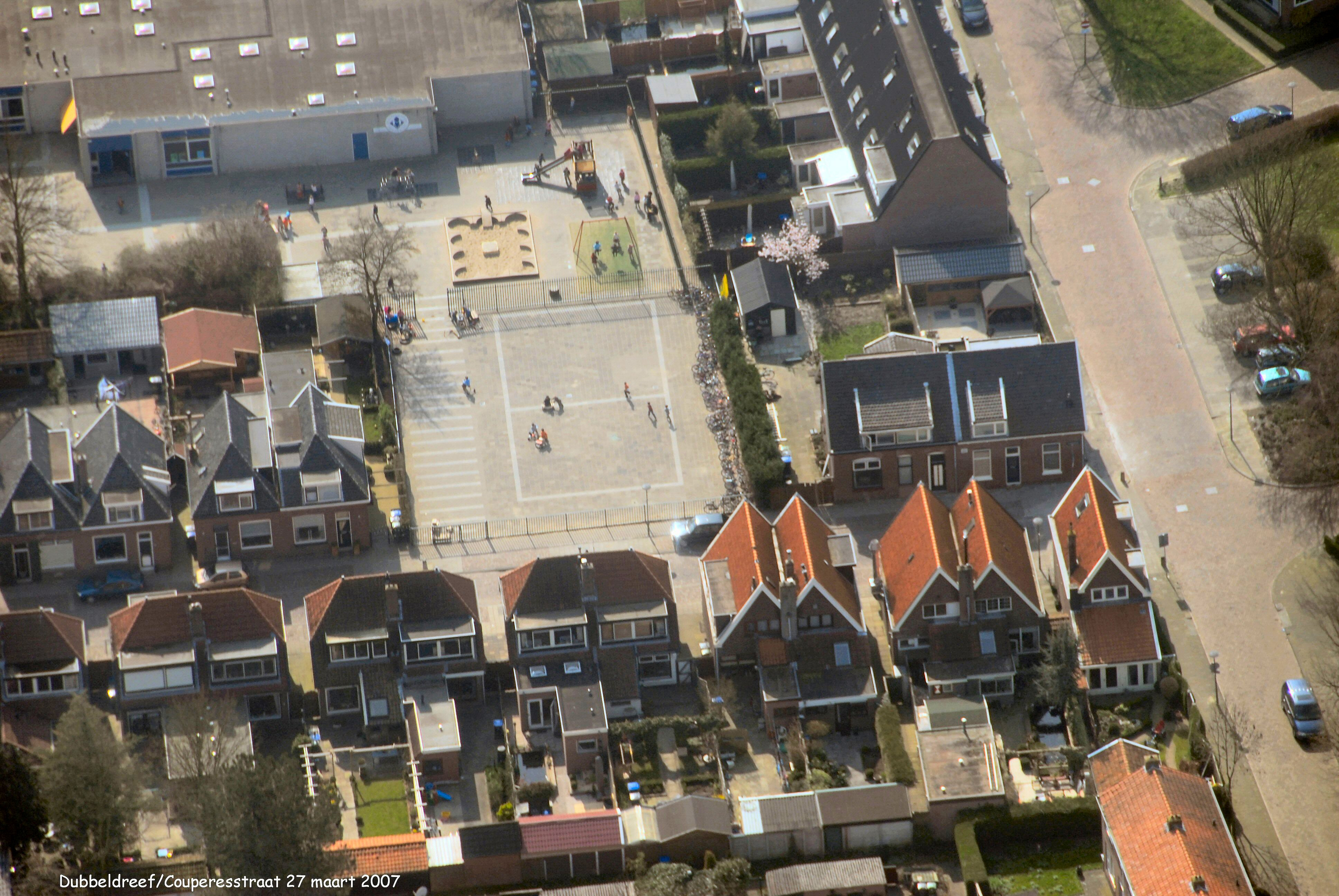 Rechts is de Couperusstraat met van links naar rechts de Dubbeldreef. Links boven de Beatrixschool gezien in Zuidelijke richting.