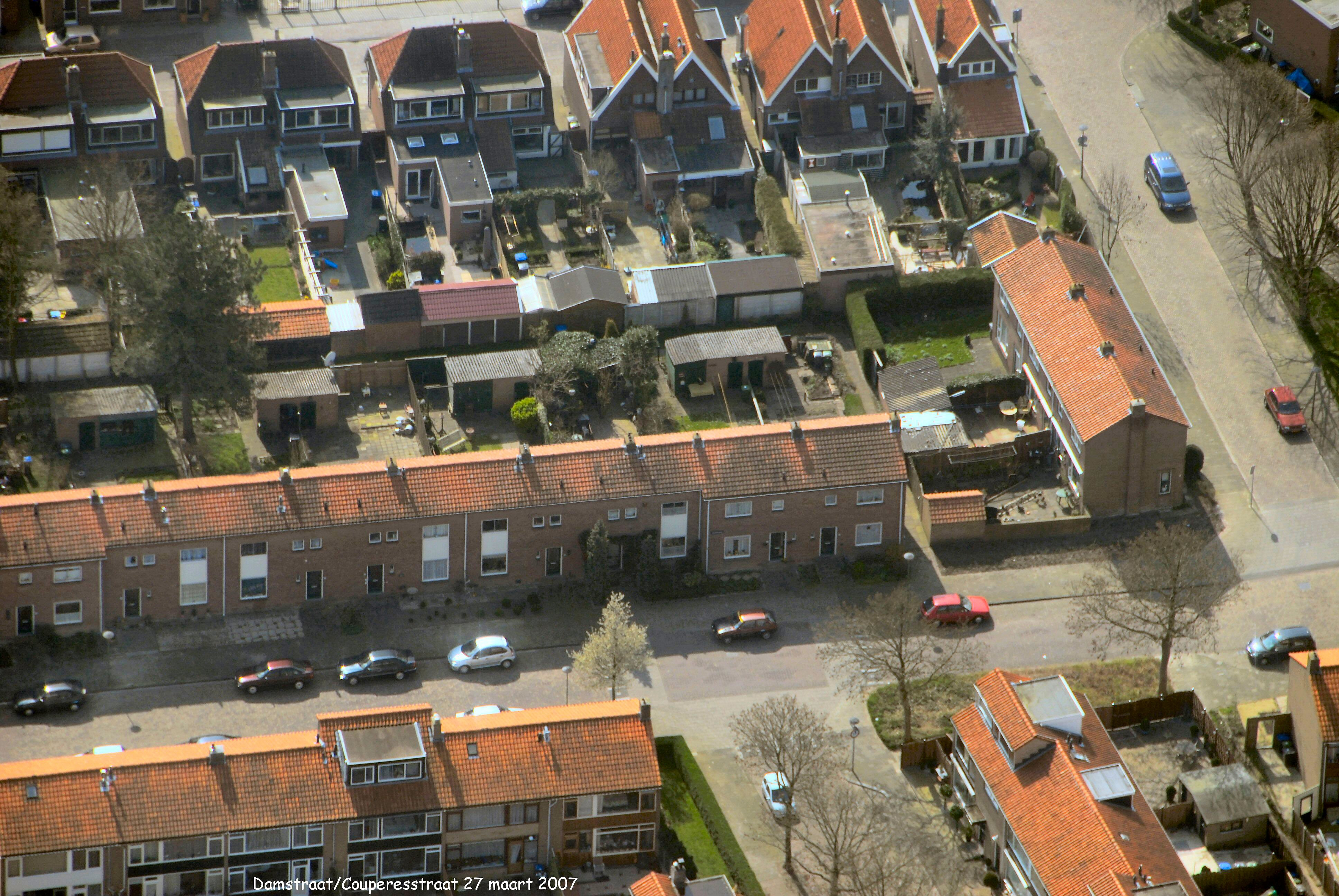 Onder van links naar rechts is de Damstraat met rechts de Couperusstraat gezien in Zuidelijke richting.