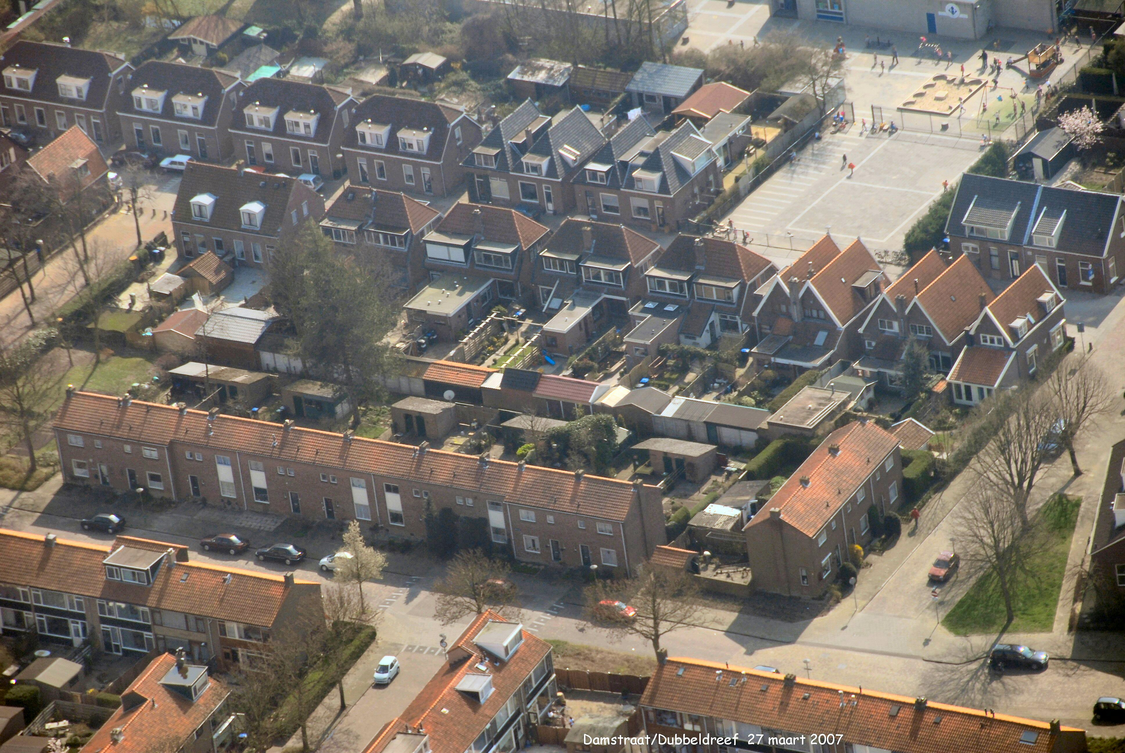 Links boven naar rechts is de Dubbeldreef. onder van links naar rechts is de Damstraat. Midden rechts naar onder is de Couperusstraat. gezien in Zuid/Oostelijke richting.