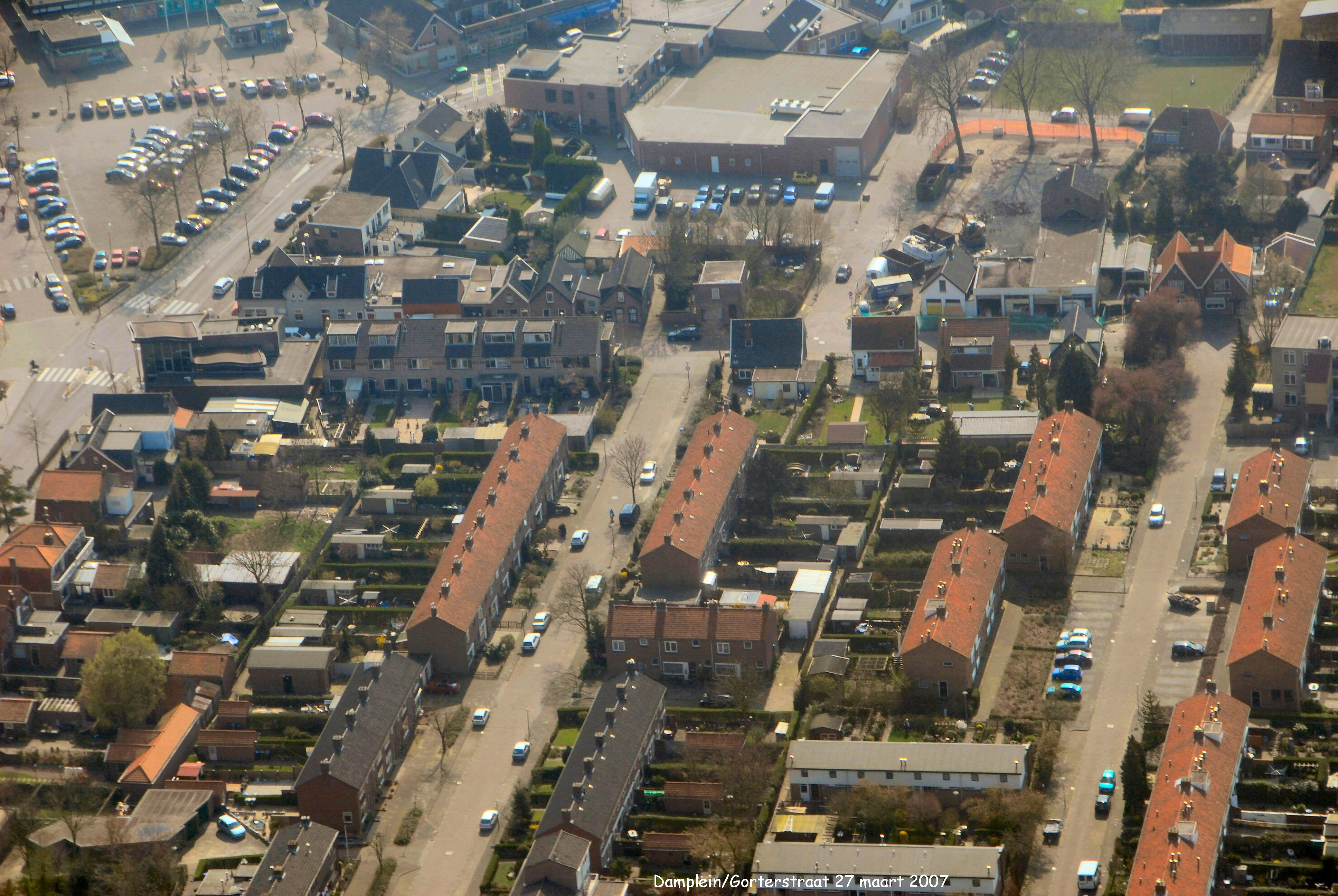 Links boven is het Damplein. rechts is de Gorterstraat met links er van de Van Deysselstraat gezien in Zuid/Oostelijke richting.