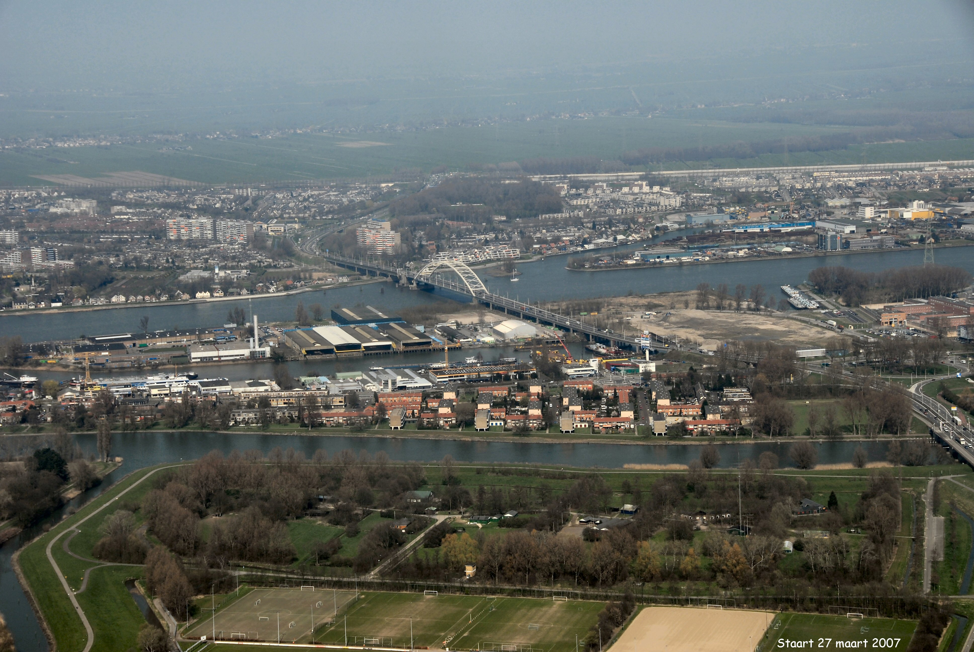 Links onder is de Vlij. Midden links naar rechts is het Wantij met de Staart er boven. In het midden is de Beneden Merwede met de brug naar Papendrecht. gezien in Noord/Oostelijke richting.