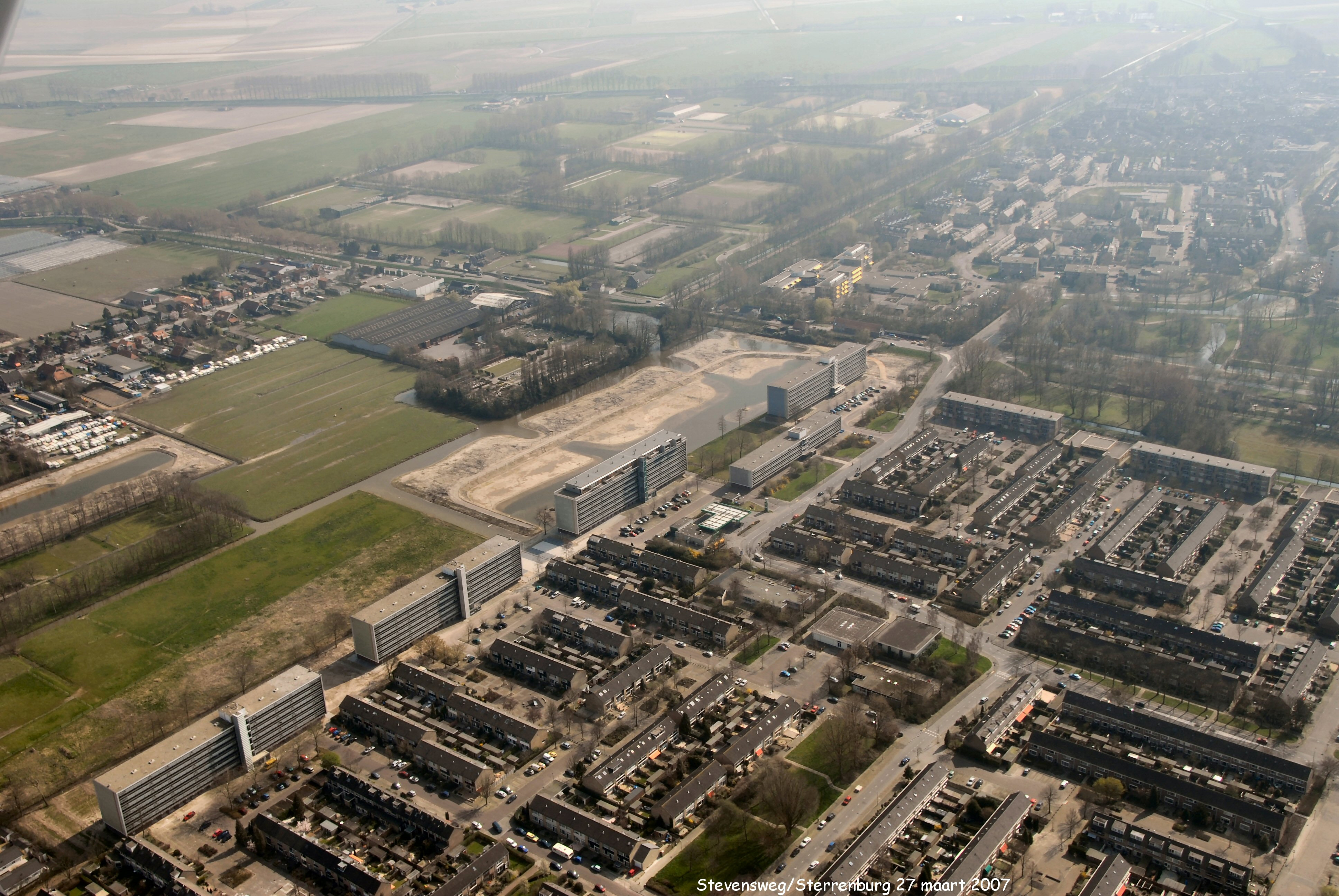 Midden links is de Stevensweg. Rechts onder is Sterrenburg !. Midden rechts naar links is de Zuidendijk met de Zeedijk geheel boven gezien in Zuid/Oostelijke richting.