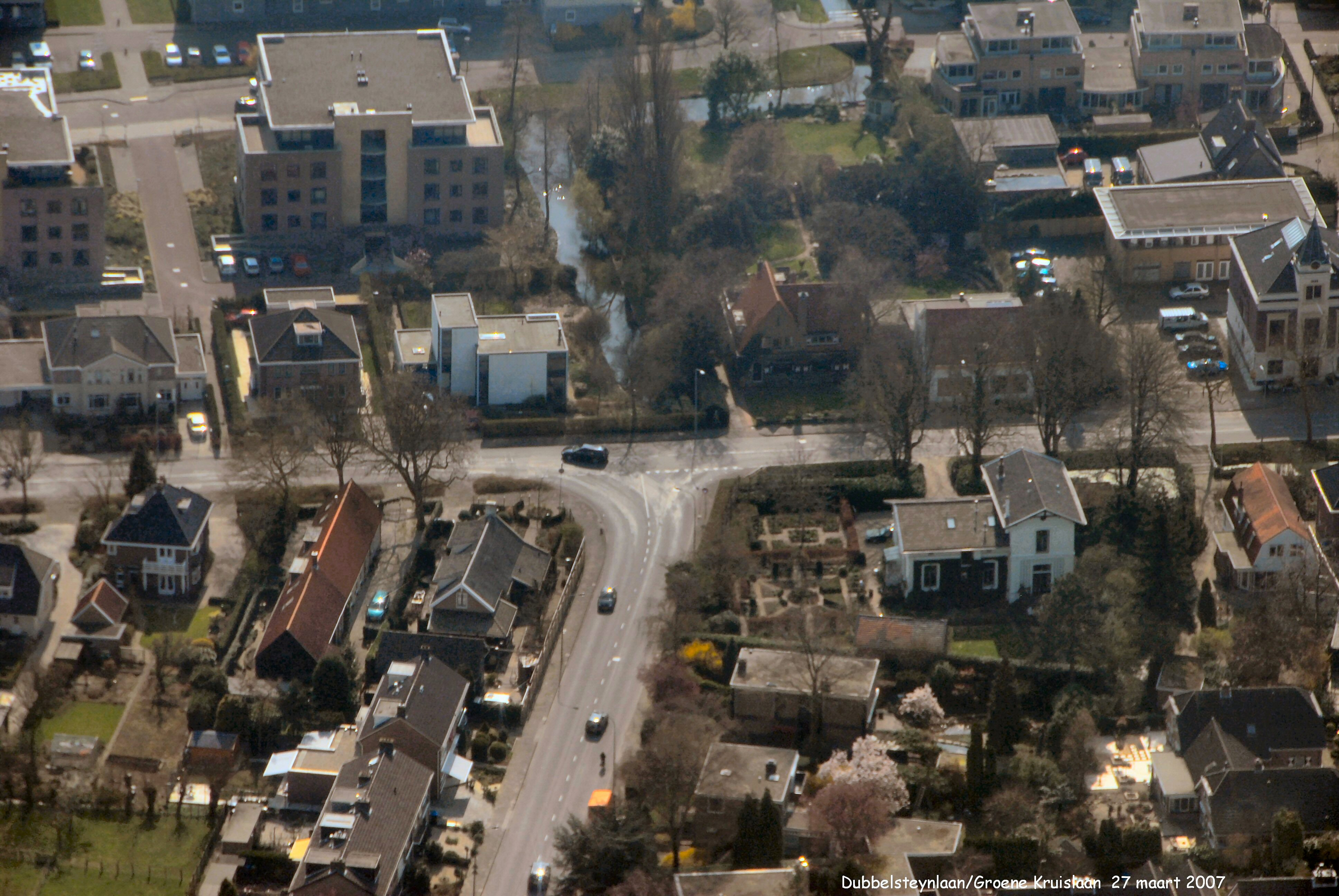 Mid.onder is de Groene Kruislaan met van links naar rechts de Dubbelsteynlaan gezien in Zuidelijke richting.