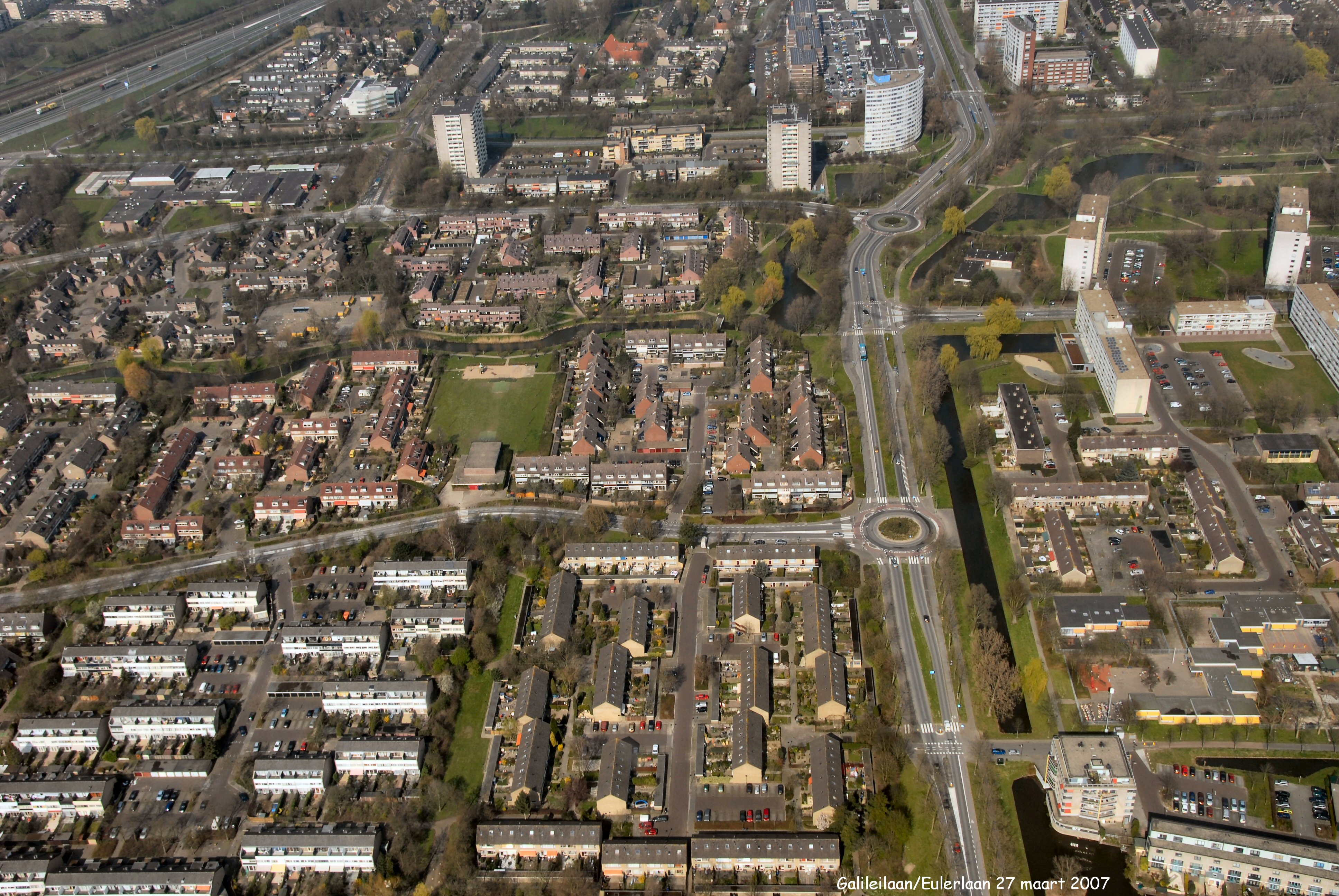 Links boven is de Rondweg. Mid.boven naar onder is de Galileilaan. Midden links naar rechts is de Eulerlaan gezien in Noord/westelijke richting.