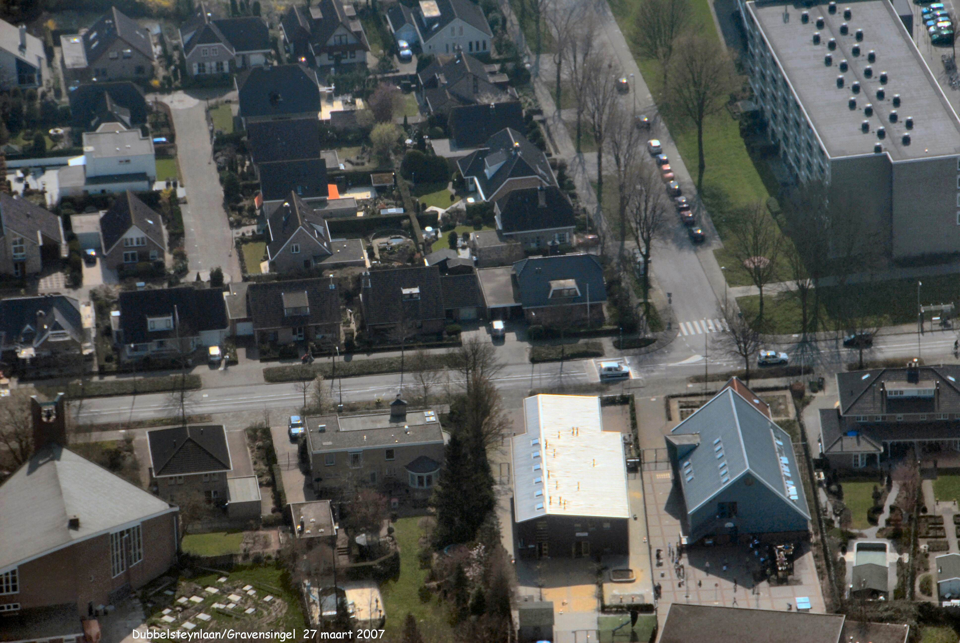 Van links naar rechts is de Dubbelsteynlaan met links onder de Hervormde Kerk. Rechts boven is Gravenhorst. Mid.boven naar onder is de Gravensingel gezien in Zuidelijke richting.