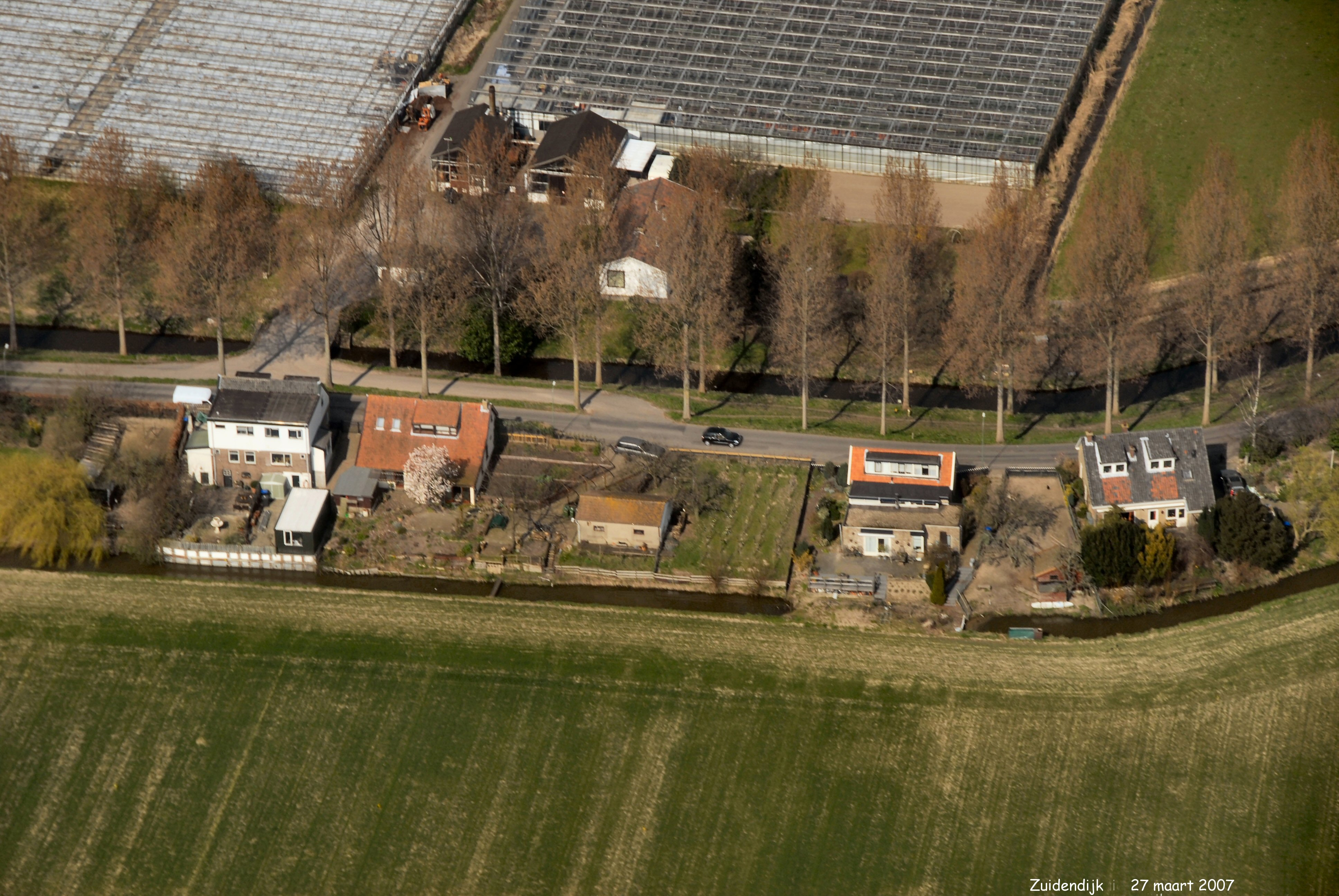 Zuidendijk met boven voormalige kassen van Valk, later kwekerij van Alphen gezien in Noordelijke richting.