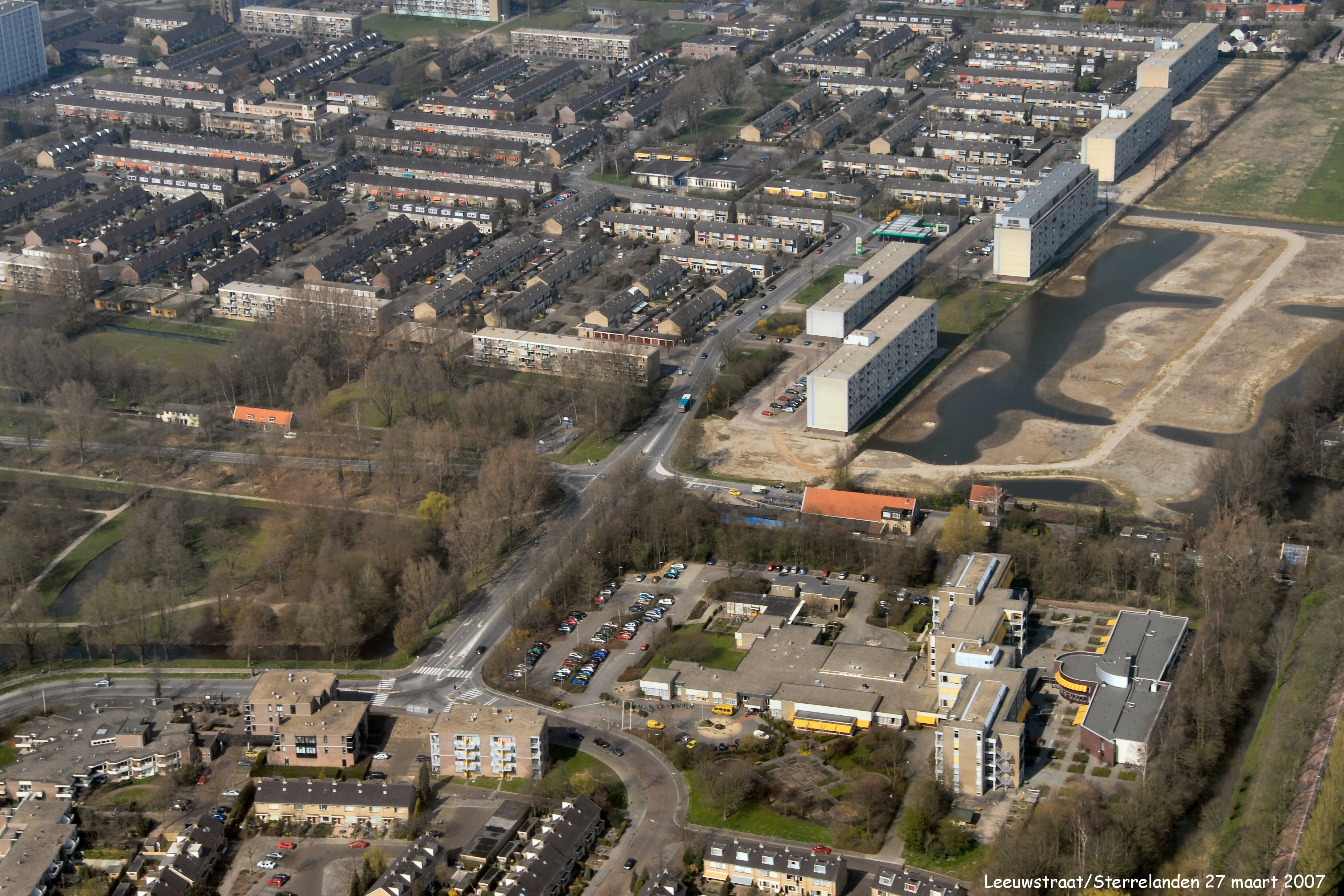 Mid.links naar rechts is de Zuidendijk. rechts onder is de Sterrenlanden. Mid.onder is de Minnaertweg. boven is Sterrenburg 1 gezien in Noord/Westelijke richting.