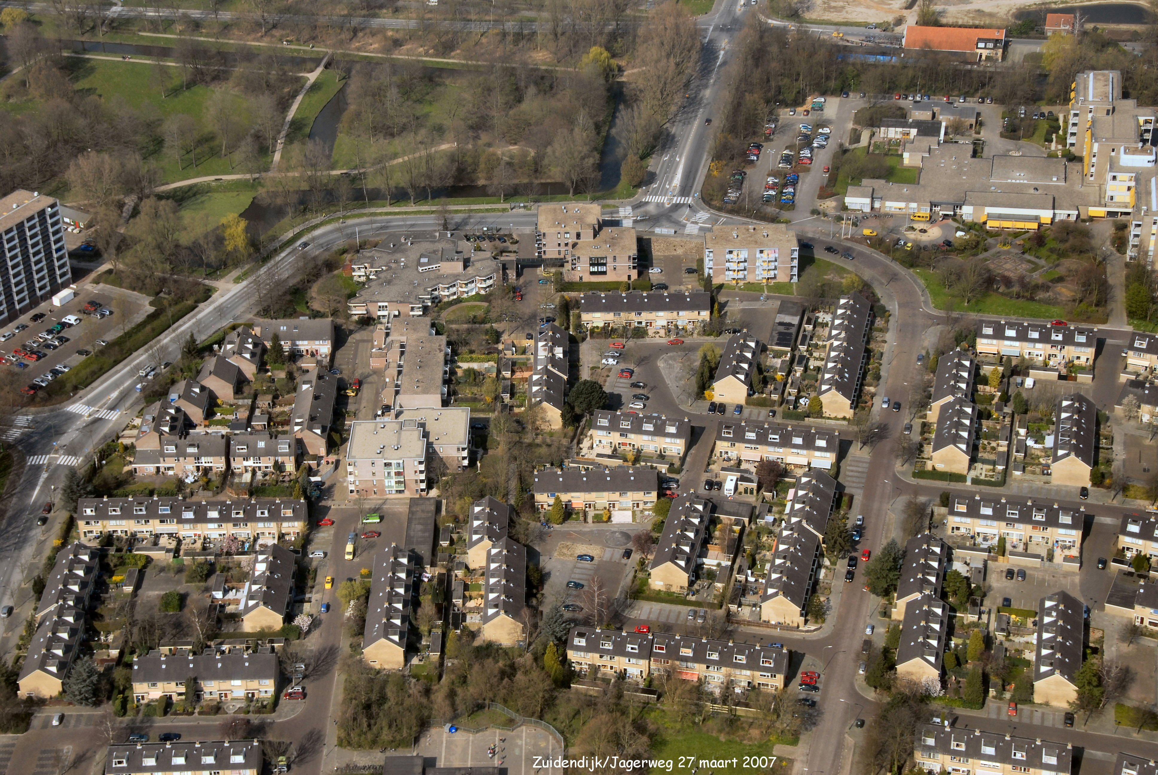 boven van links naar rechts is de Zuidendijk met de Copernicusweg er onder. Links is de Jagerweg en rechts de Minnaertweg in Sterrenburg 2 gezien in Noordelijke richting.