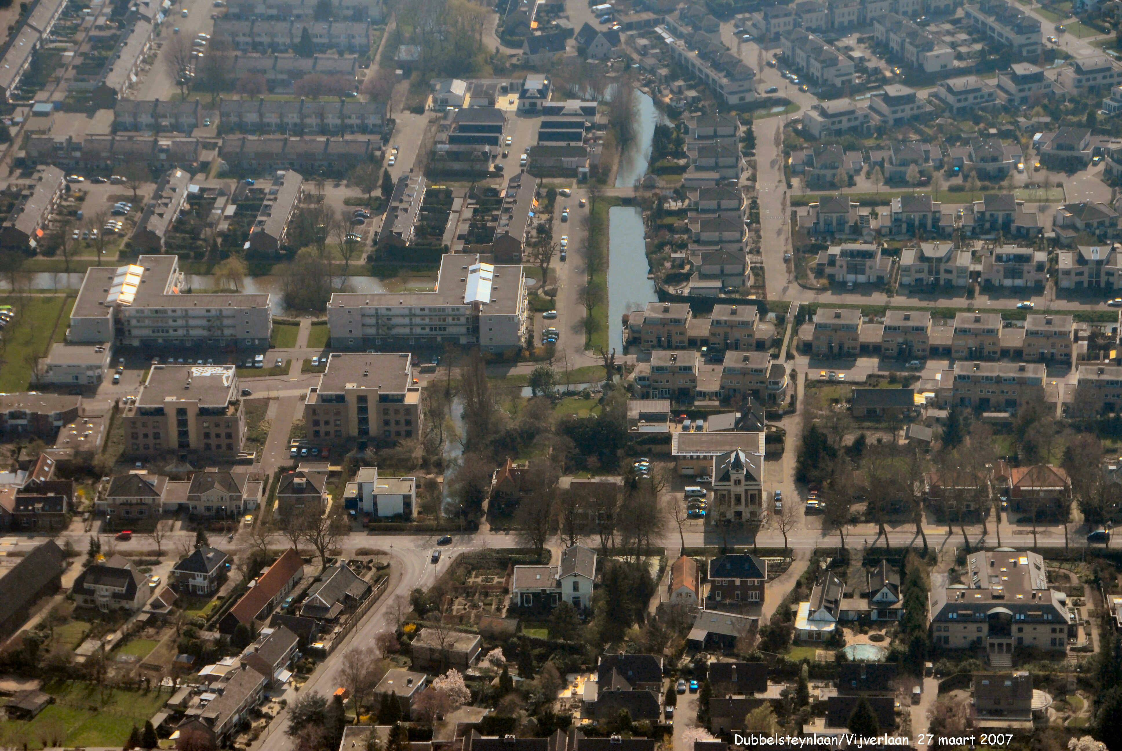 Midden van links naar rechts is de Dubbelsteynlaan met het voormalig Gemeentehuis van Dubbeldam. Rechts boven is het Beelaertspark. Mid.links is het Vijverplantsoen aan de Vijverlaan gezien in Zuidelijke richting.