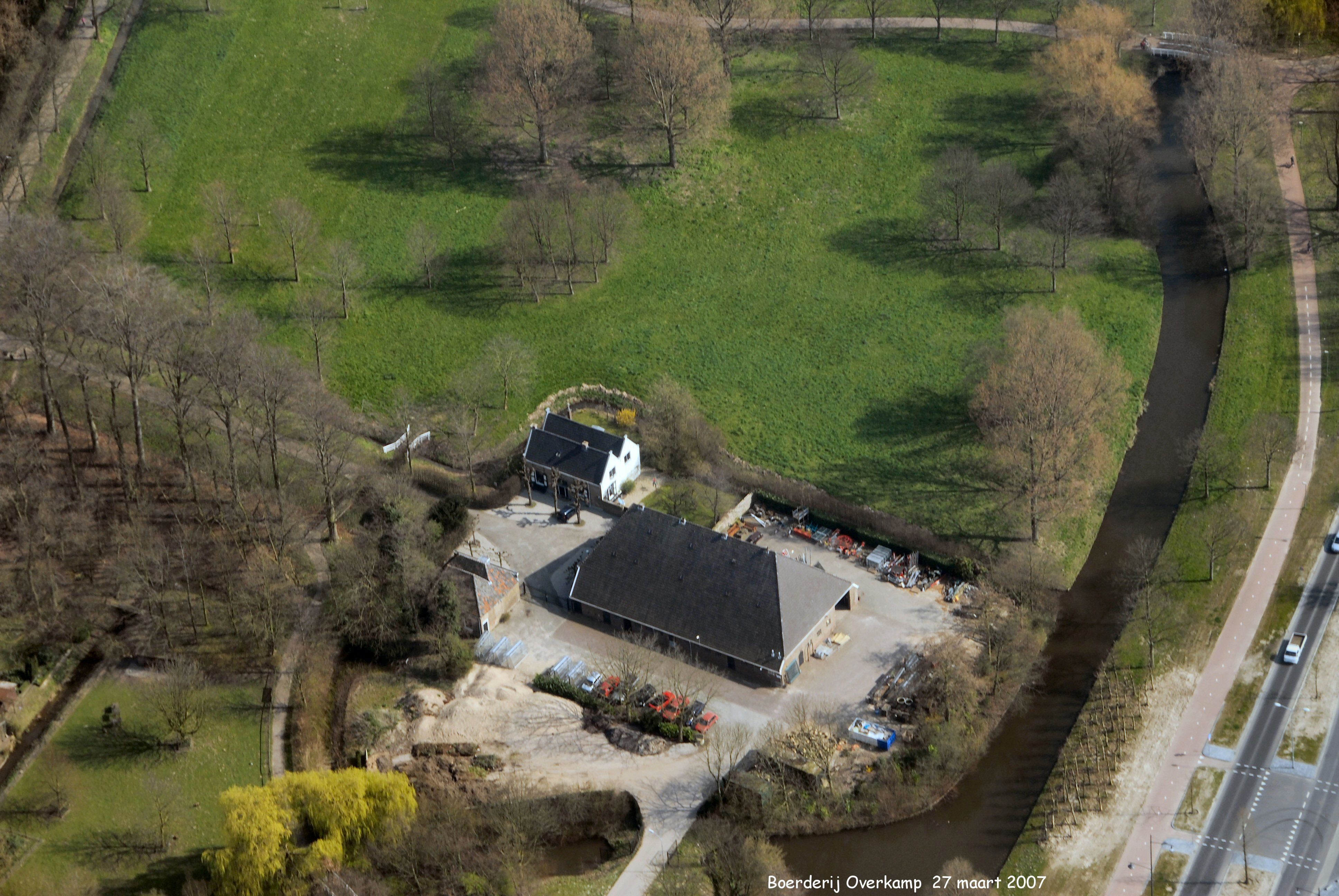 Dit is boerderij Overkamp aan de Achterweg met rechts onder nog een stukje van de Overkampweg gezien in Oostelijke richting.