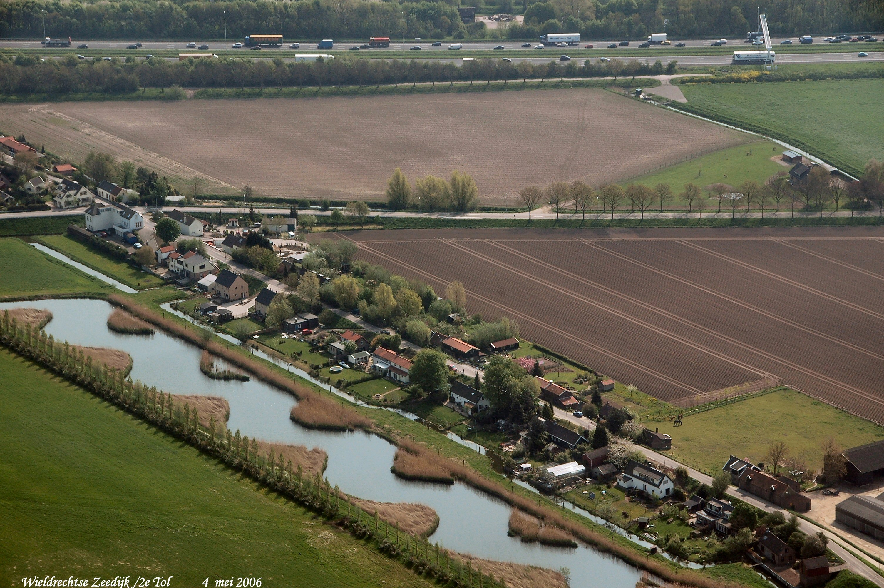 Mid.links naar rechts is de Rijksstraatweg met de A16 boven. Rechts onder naar links boven is de Wieldrechtse Zeedijk gezien in Zuid/Oostelijke richting.
