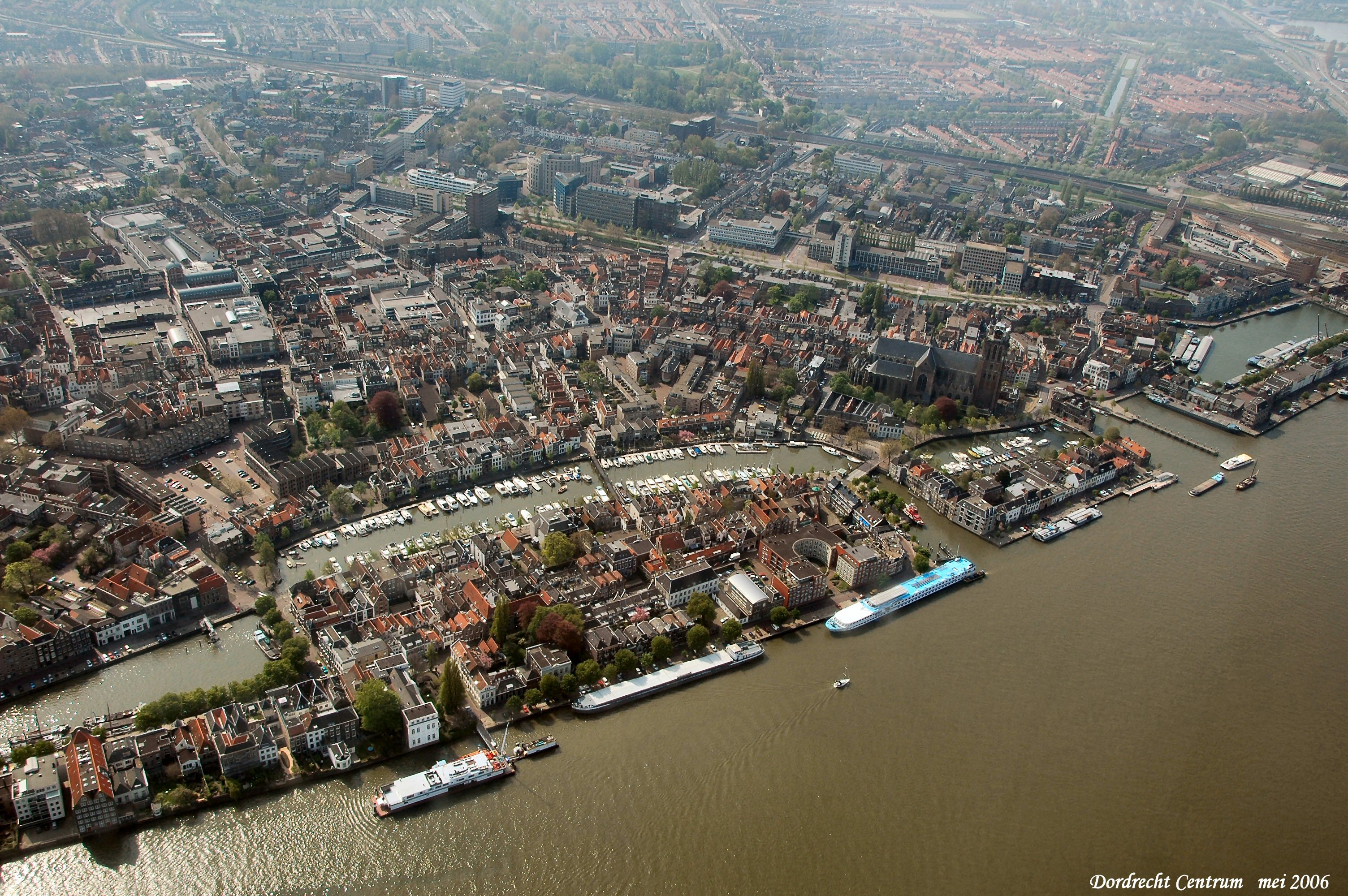 Onder is de Oude Maas met vnr Wolwevershaven-Nieuwe Haven-Maartensgat en de Kalkhaven met het centrum van Dordrecht op de achtergrond. gezien in Zuid/oostelijke richting.