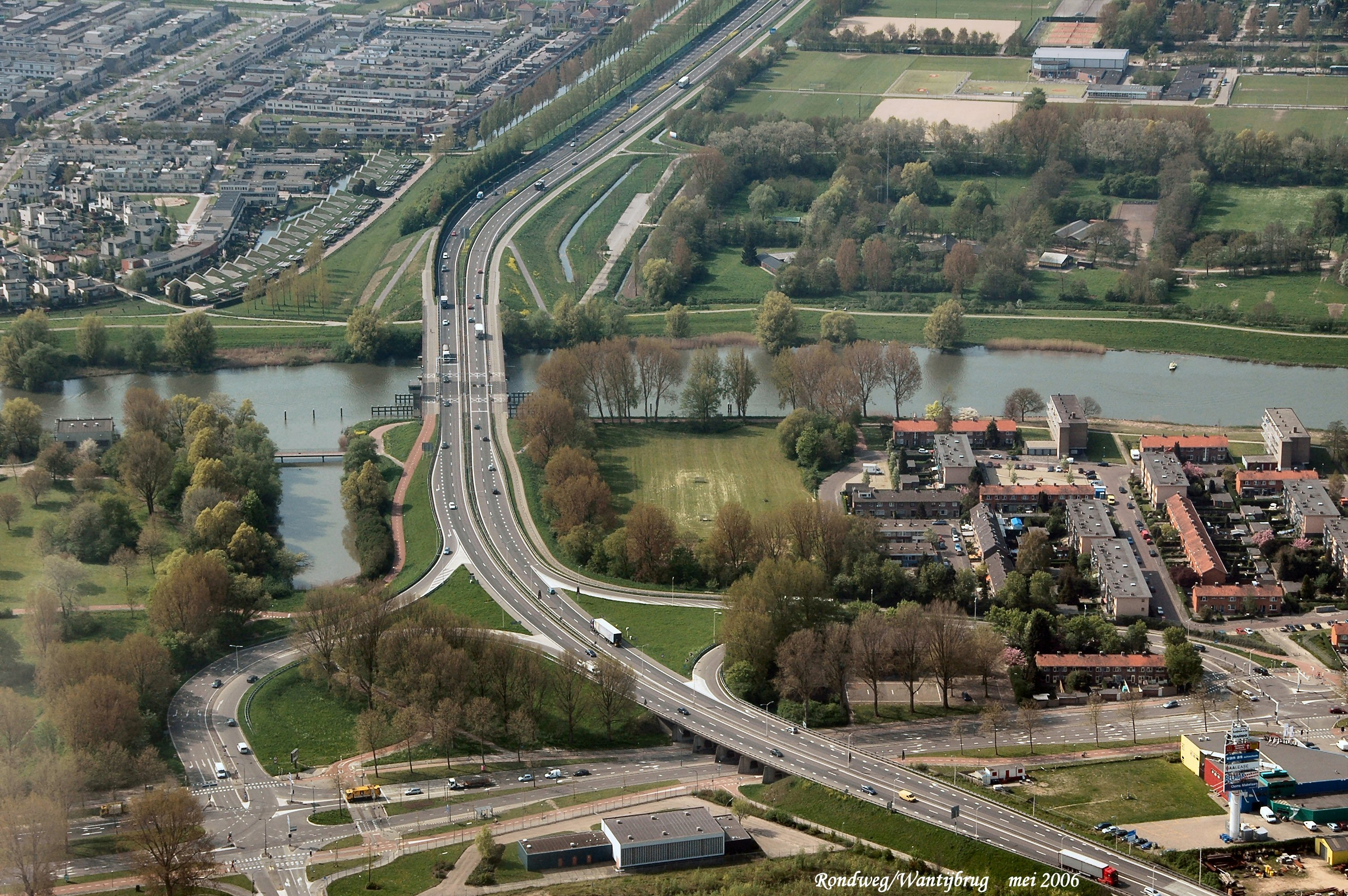 Rondweg (N3) met links boven Oudelandshoek en mid. rechts het Jeugddorp.Onder is de Staart gezien in