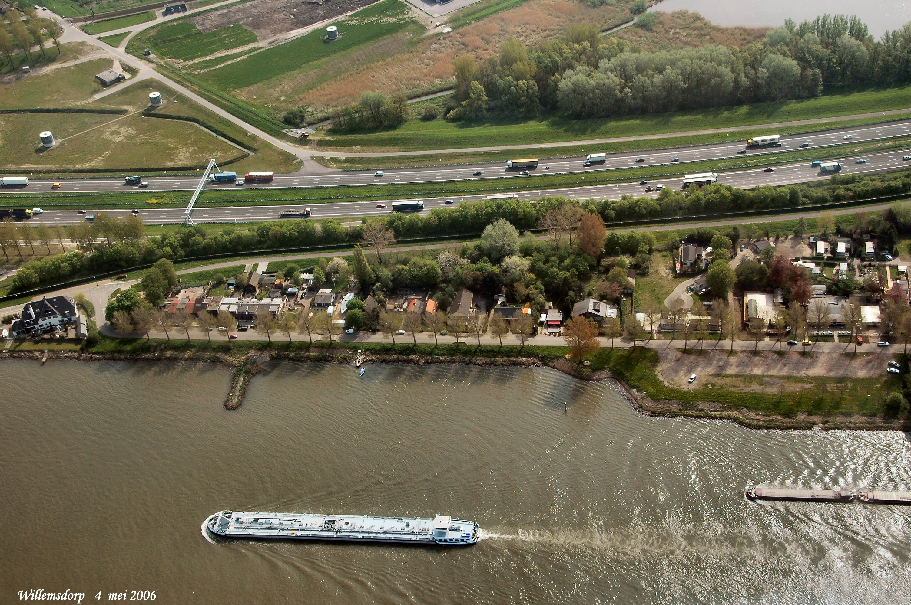 Willemsdorp met de A16 in het midden en de Rijksstraatweg er onder Boven is Polder Oudendijk gezien in Oostelijke richting.