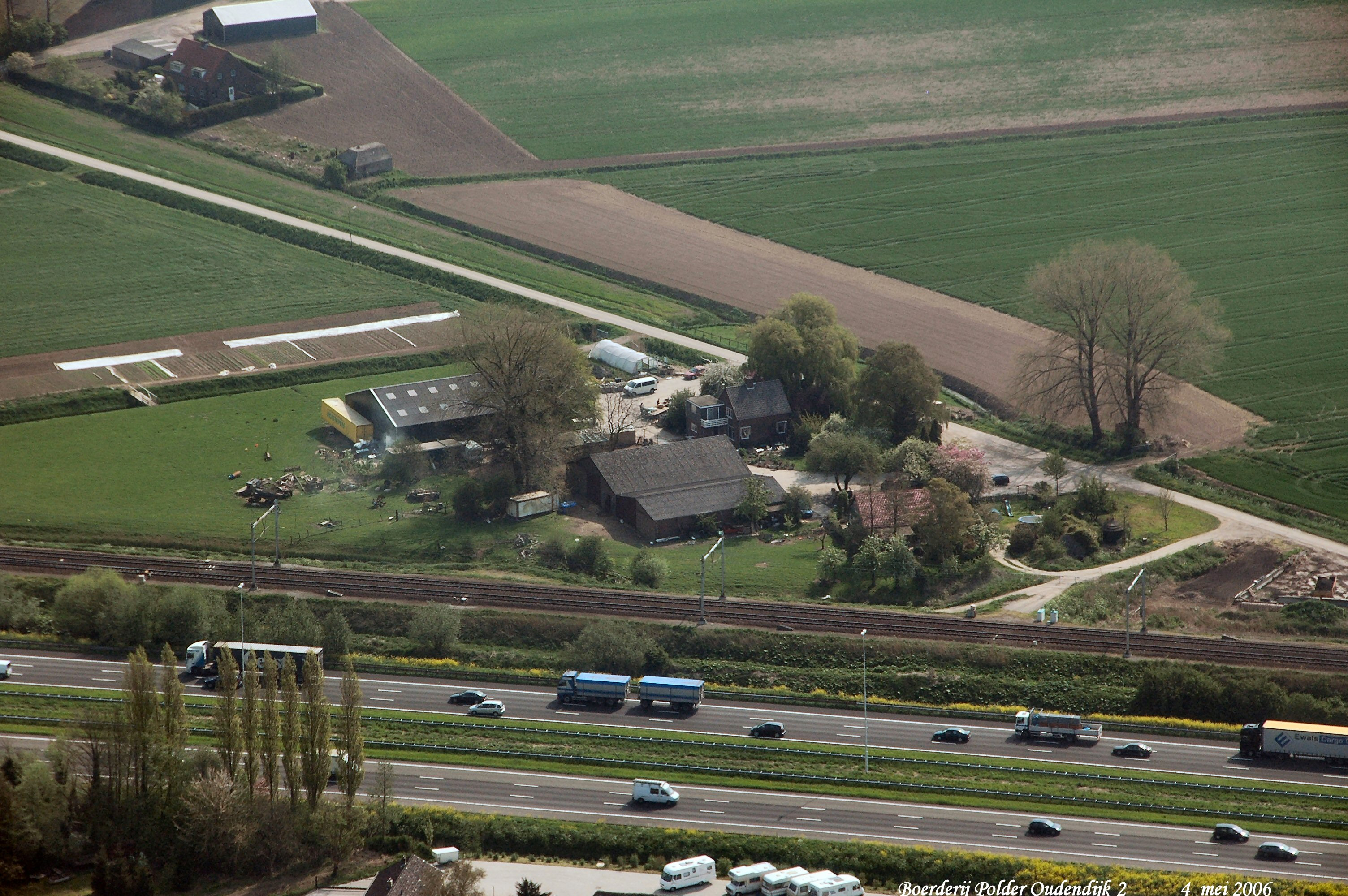 Onder is de A16 met de spoorlijn Dordrecht-Breda er boven. Boven is de Polder Oudendijk. gezien in Oostelijke richting.