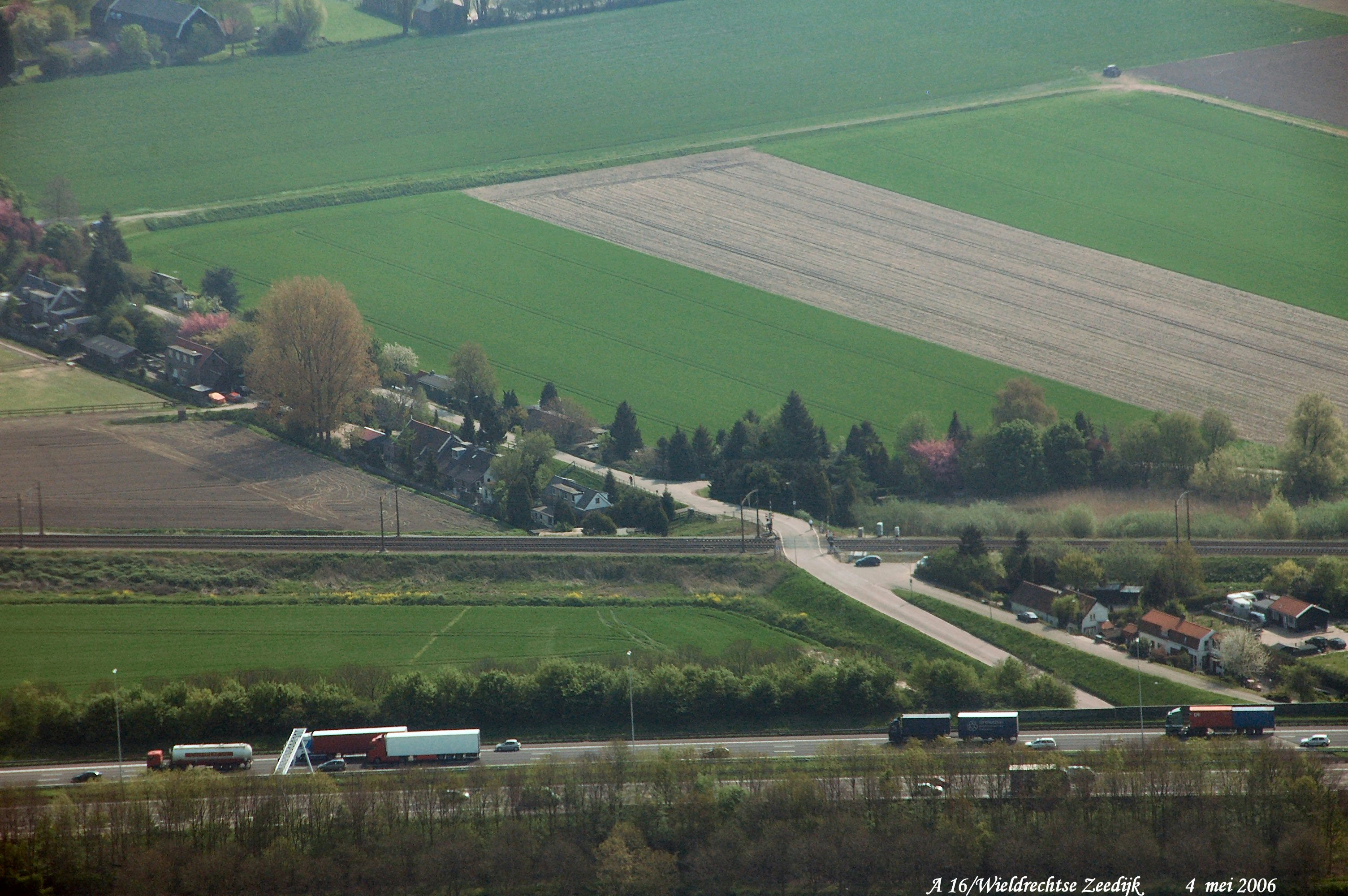 Onder is de A16 met de spoorlijn Dordrecht-Breda er boven. haaks er op is de Wieldrechtse Zeedijk (2e Tol.) gezien in Zuid/oostelijke richting.