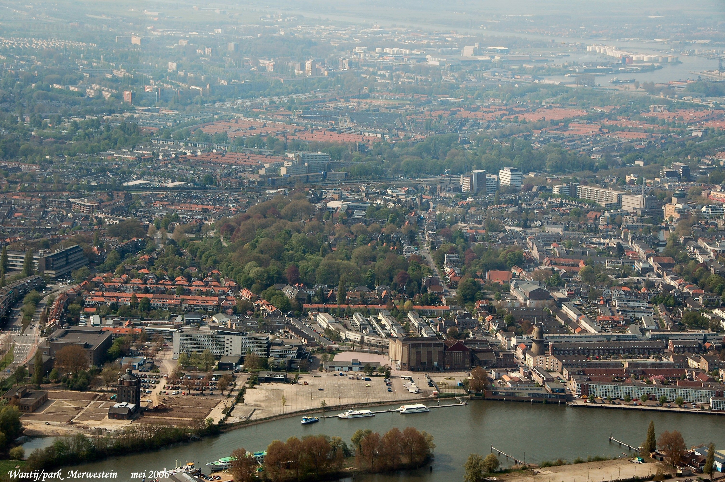 Onder is het Wantij met molen "Kijk over de Dijk"er boven, rechts onder naar boven is de Oranjelaan met Park Merwestein in het midden gezien in Zuid/Oostelijke richting.
